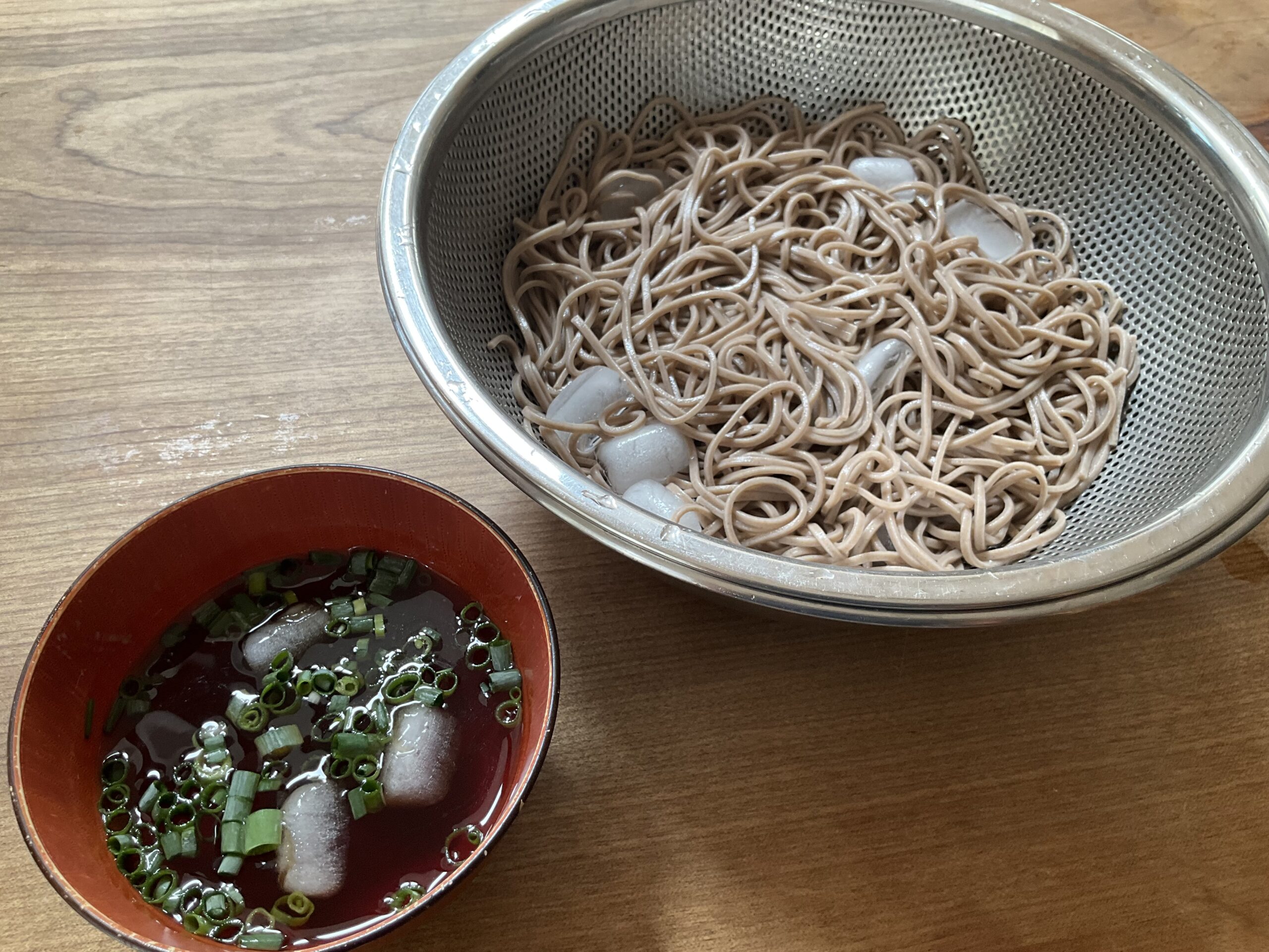 在宅勤務で一人で昼食の月曜日、昨日買った食塩不使用の麺を早速食べてみる。食塩不使用のそば。