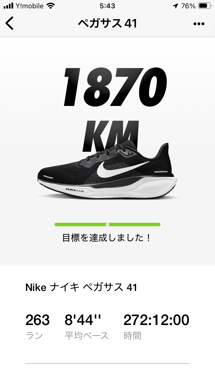 ちなみに靴紐が切れた黒いペガサス、シューズの走行距離は1870キロ。去年11月に下ろしたので約10ヶ月。ソールはかなり摩耗している。お疲れ様でした。