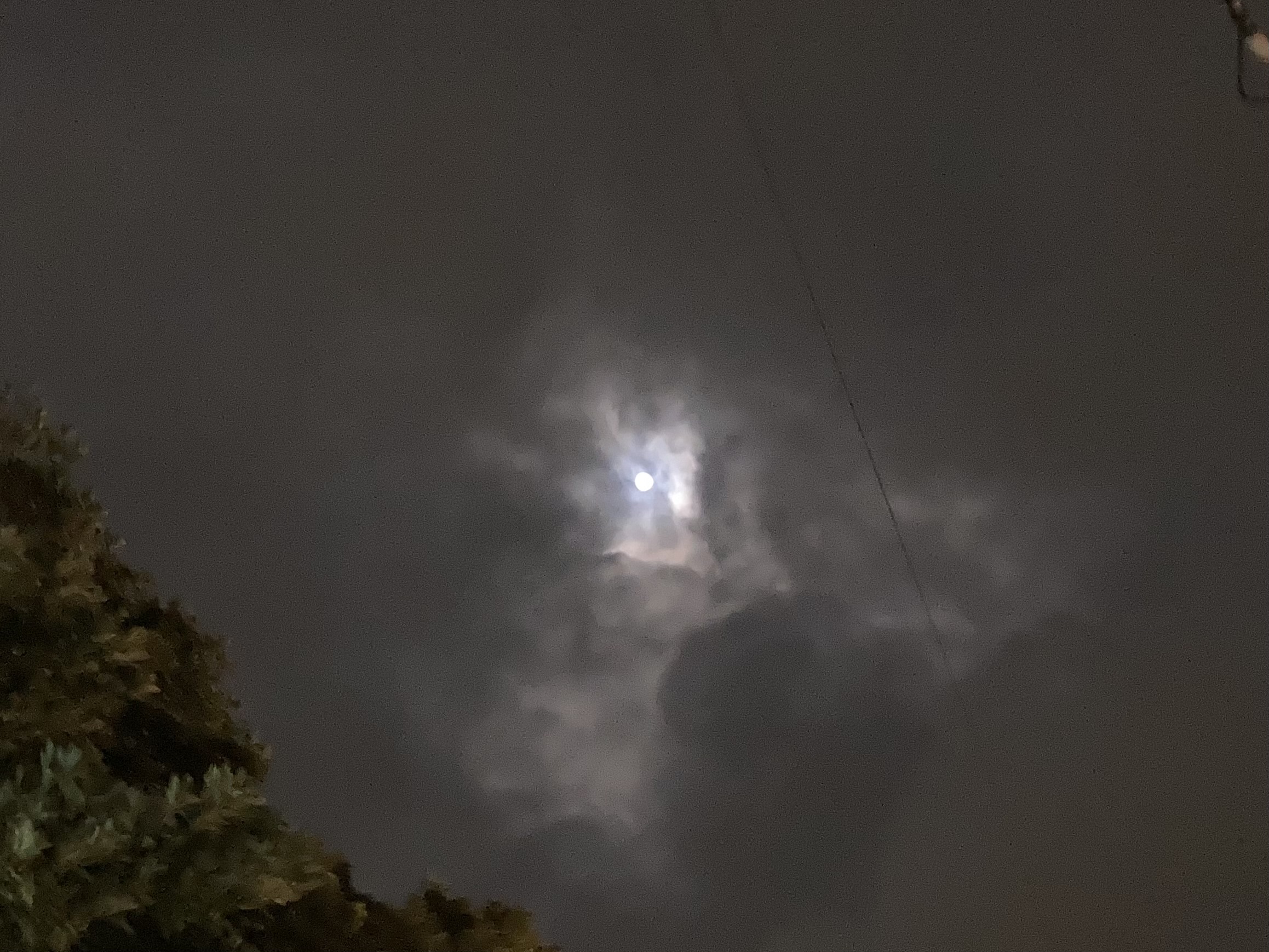 そんなことを考えながら帰っていたら妻からLINEで「月見だからなんかお団子っぽいもの買ってきて」と。でももう横浜駅で京急に乗ったあとなので、あとは逗子葉山駅前のセブンしか買うところはない。一応セブンであんこの串団子を買うが、そもそも月、見えてないじゃん、と思いながら自転車で走っていたら、雲間から朧月がのぞいたので自転車を止めて一枚。