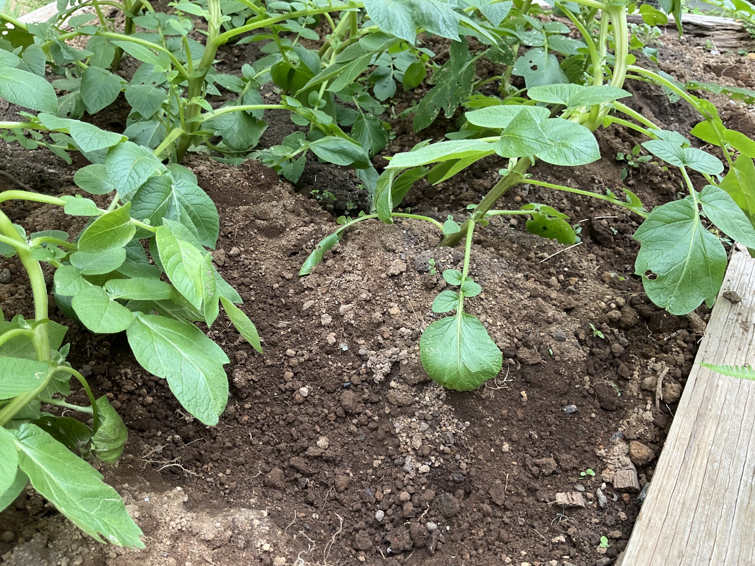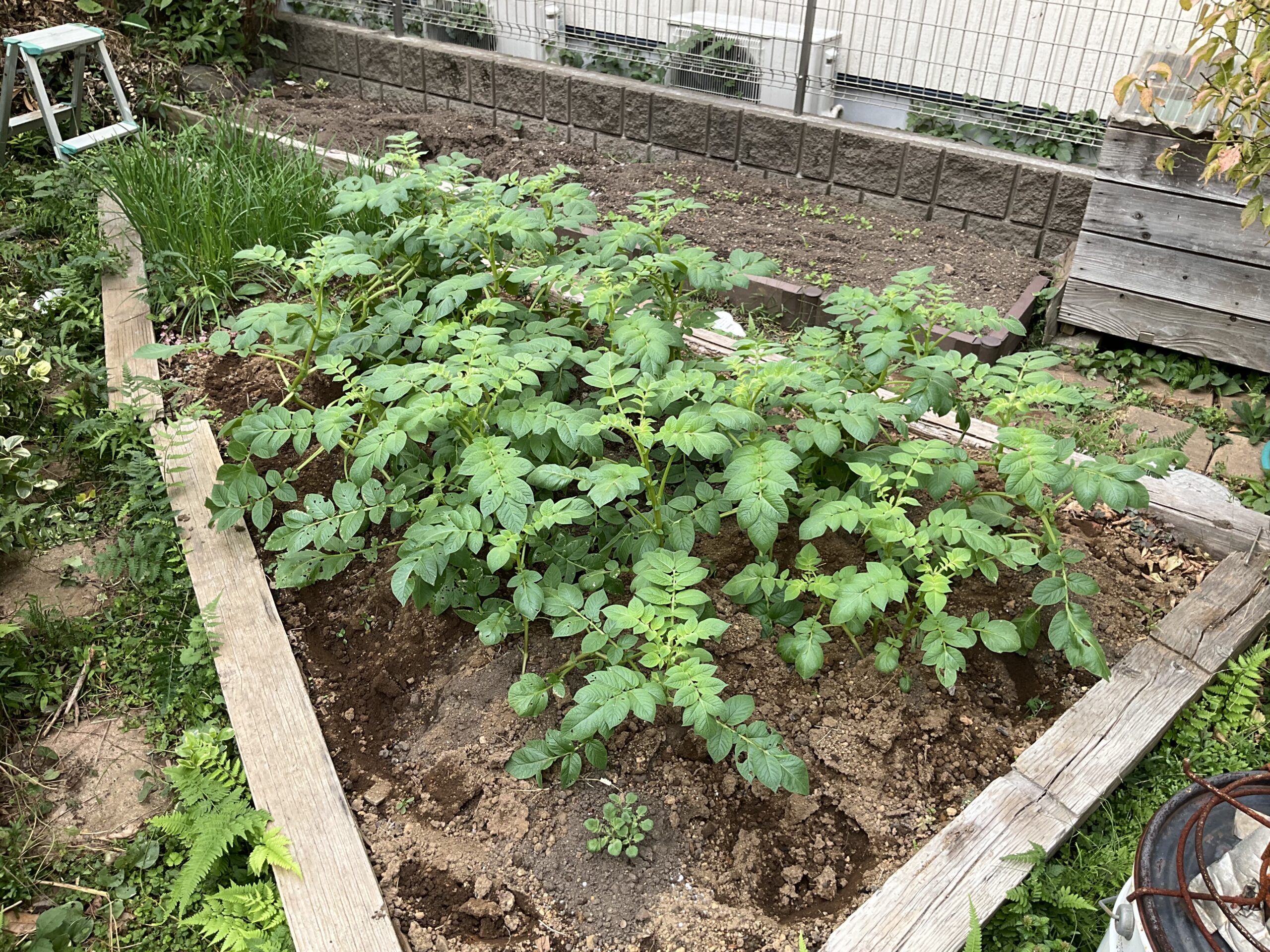 庭の畑に植えたジャガイモが結構旺盛に育ってきた。真面目にジャガイモを植えたのは初めてだが、どうやら土寄せという世話が必要らしい。ジャガイモは割と地面に近いところにできるらしく、放っておくと芋が陽に当たり緑になってしまうらしい。そこで茎が伸びてきたら、周りの土を株元に寄せて深くする必要があるそうな。その際に追肥もすると良いらしい。という事で、仕事の合間にマグァンプKを撒いてスコップで土を寄せた。