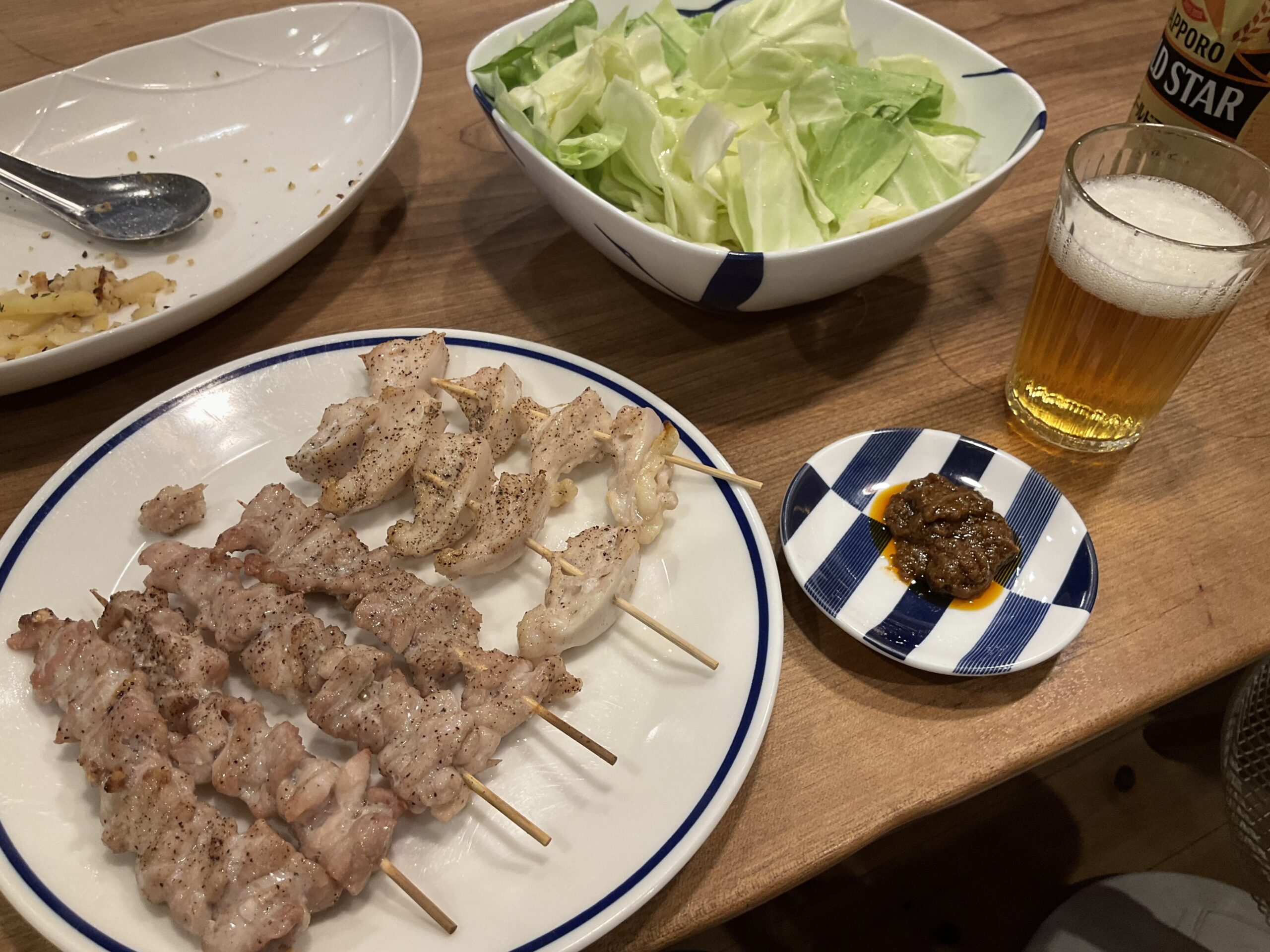 今日は帰りに鶏肉を買って、串に刺して焼いて一杯。付け合わせに広島で買ってきたかきみそラー油。