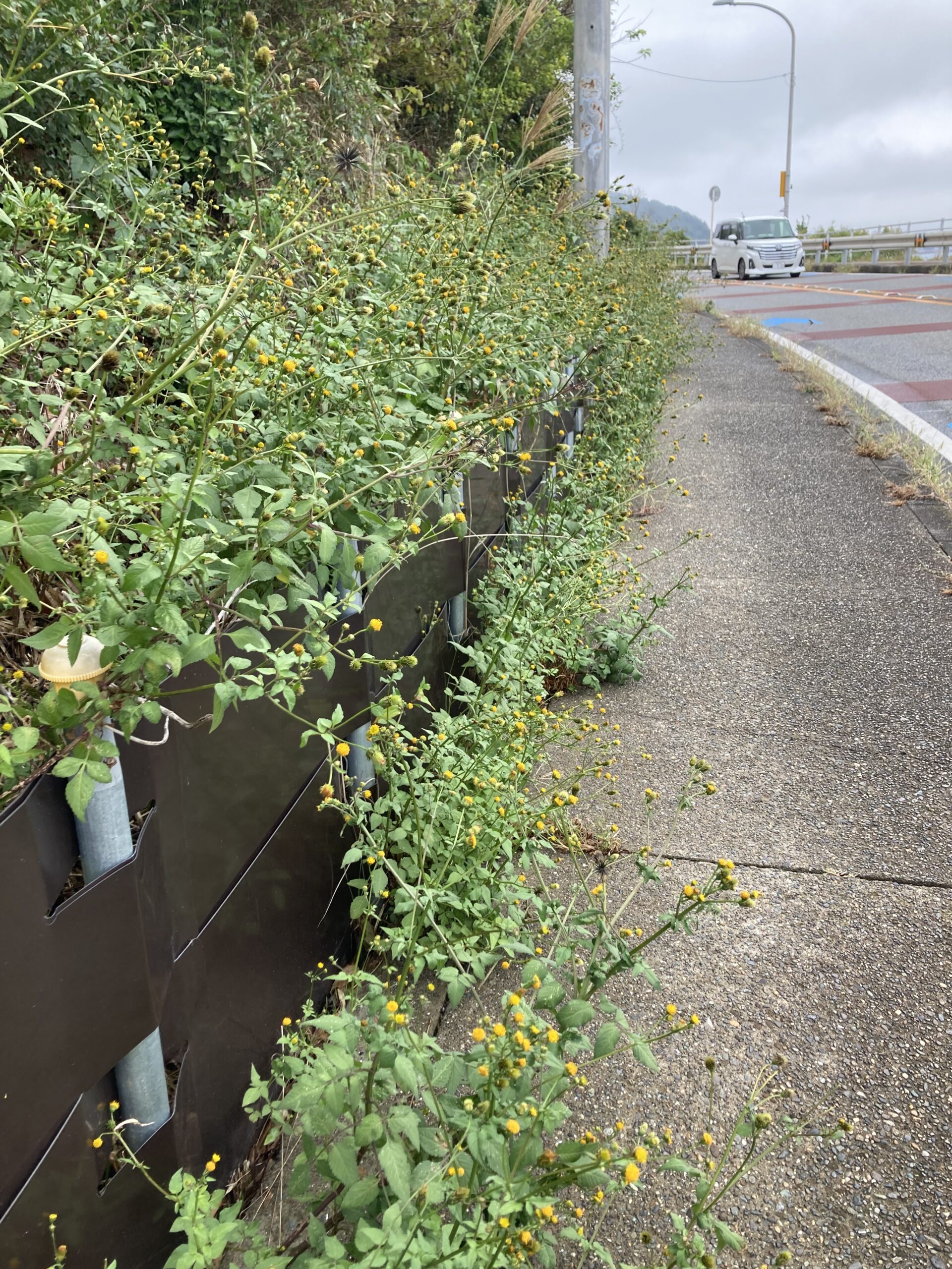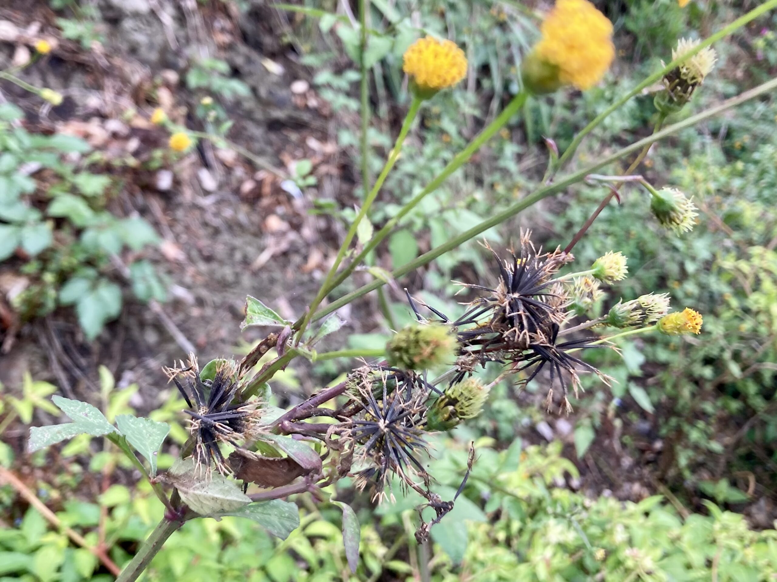 沿道に多いコセンダングサがたくさんの種を付け始めている。ひっつき虫としては、オナモミよりこれの方が厄介。生えている草むらを歩くと衣類だけでなく、靴紐とかにもびっしり付く。