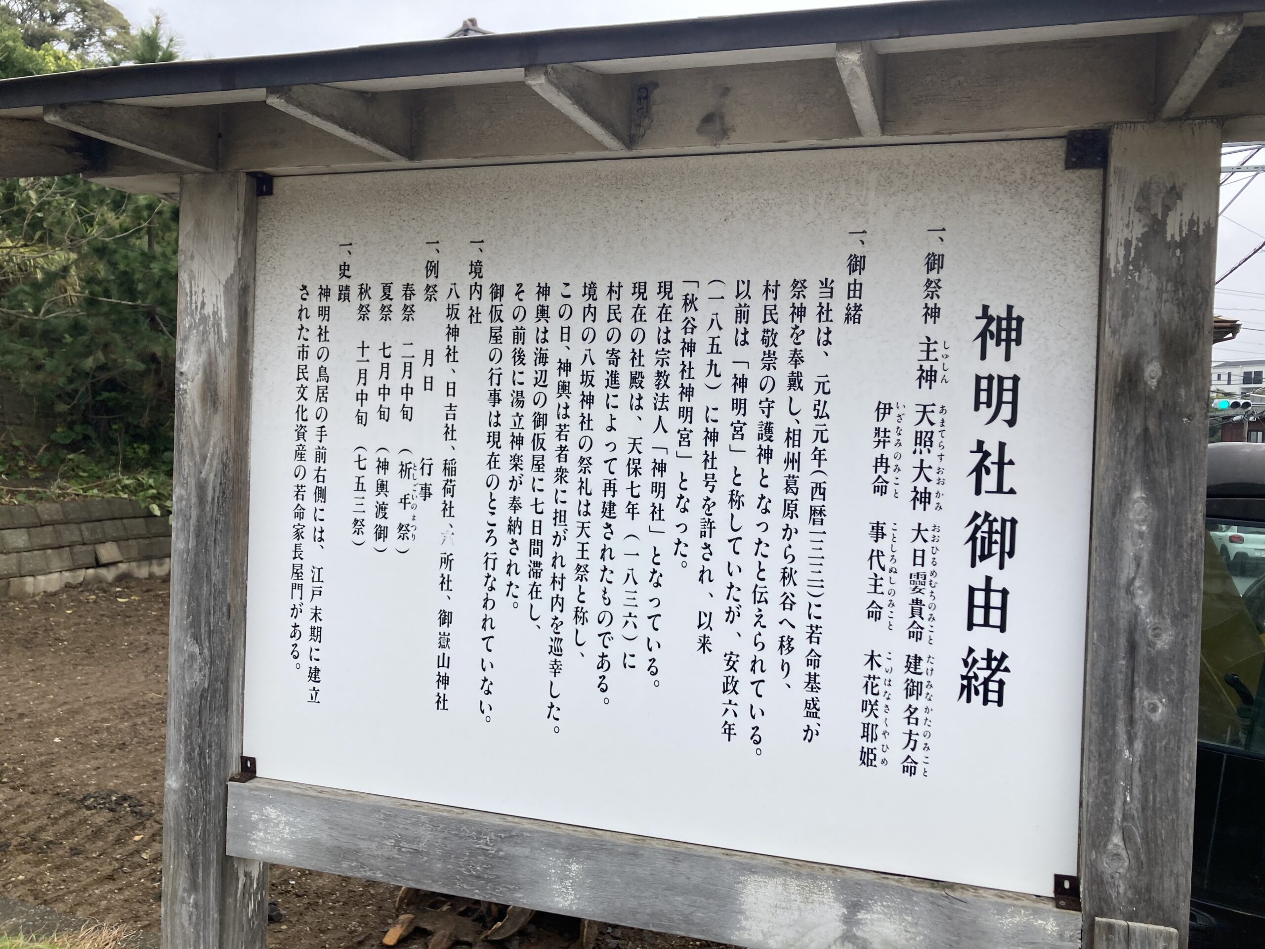 今日は佐島からの帰り、秋谷の神明社という神社を見学。私がいつも走っている佐島までの国道134号線のコース。葉山町は長者ヶ崎までで、そこから南は横須賀市となる。地名としては秋谷という。神明社はその土地神なのだと思う。秋谷はお祭りが盛んな印象で、この神明社付近で年中お祭りしている気がする。何年も前を通っているけど、これまで神社に上がったことはなかった。参道横の家屋が解体されて入り口が開けたのでなんか参道が目に付き、上がってみようと思った次第。