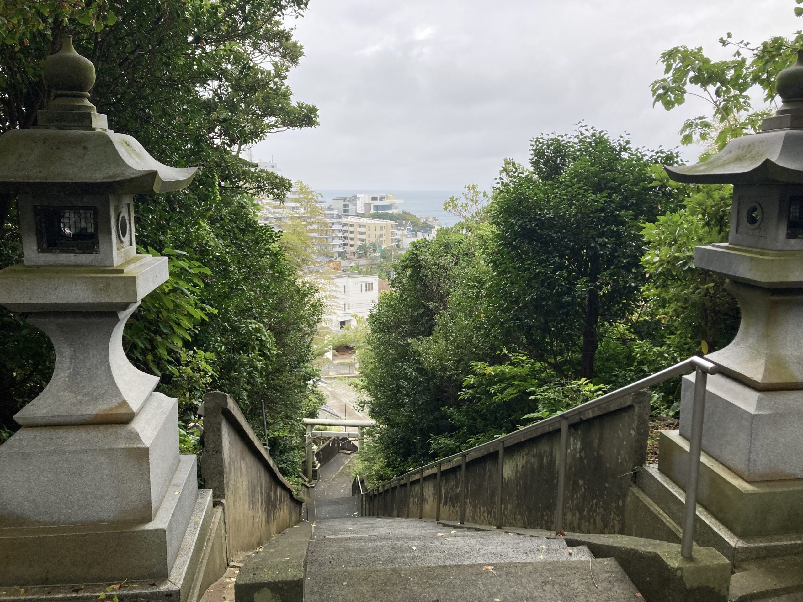 参道を上がったところにあるお社はこじんまりしていたが、色々あって、参拝の順路も示されていた。神殿の裏壁をコツコツ叩く意味はよくわからないけど、受験生3人の我が家、拾えるご利益や福はもれなくいただく必要があるので、言われた通りコツコツ叩いて歩いた。神社は結構高くて海が見える。元はもっと木が刈られて見晴らしよくなっていたのだろう。