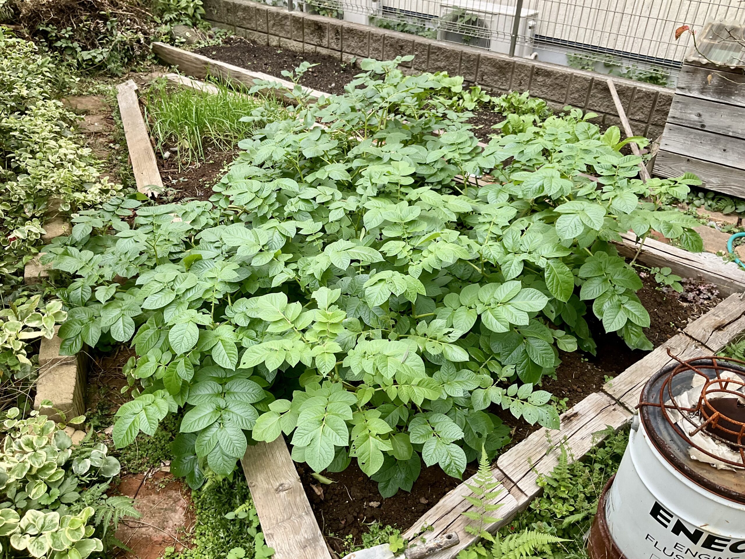 休憩して庭を観察。ジャガイモは青々と茂っている。そしてその葉にポツポツとオンブバッタ。