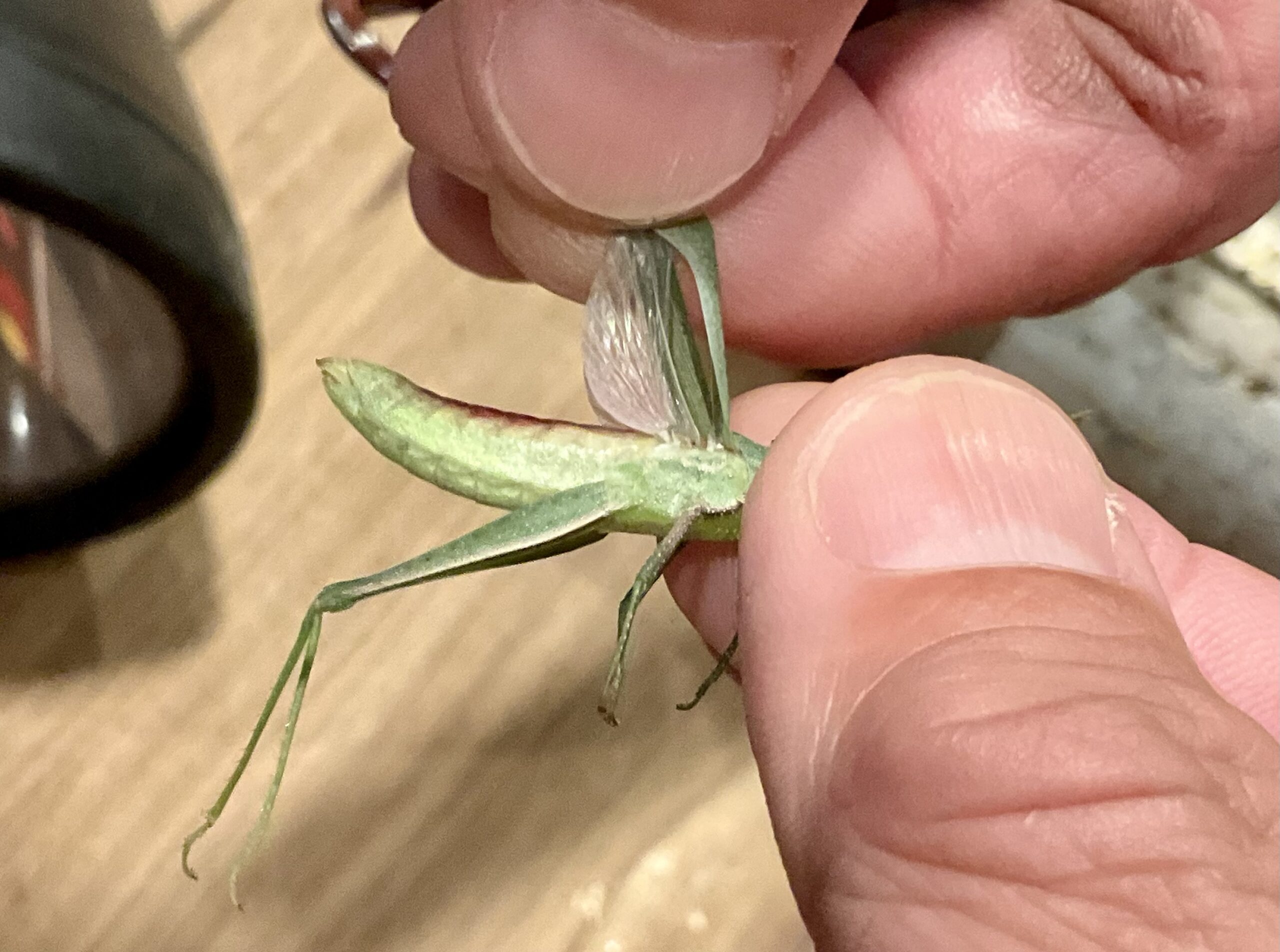 とりあえず捕まえて確かめるのが早かろう、と懐中電灯を持って庭に出てオンブバッタを捕獲。双子2号君の写真を撮ってもらった。アカハネは、翅の付け根付近が鮮やかな赤らしいが、これは赤みはないので、普通のオンブバッタのようだ。そのあと、ネットでさらに調べた限りでは、まだ関東には進出していないようだ。ただ飛翔力がオンブバッタより高いようなので、この先、現れる可能性は十分あると思う。