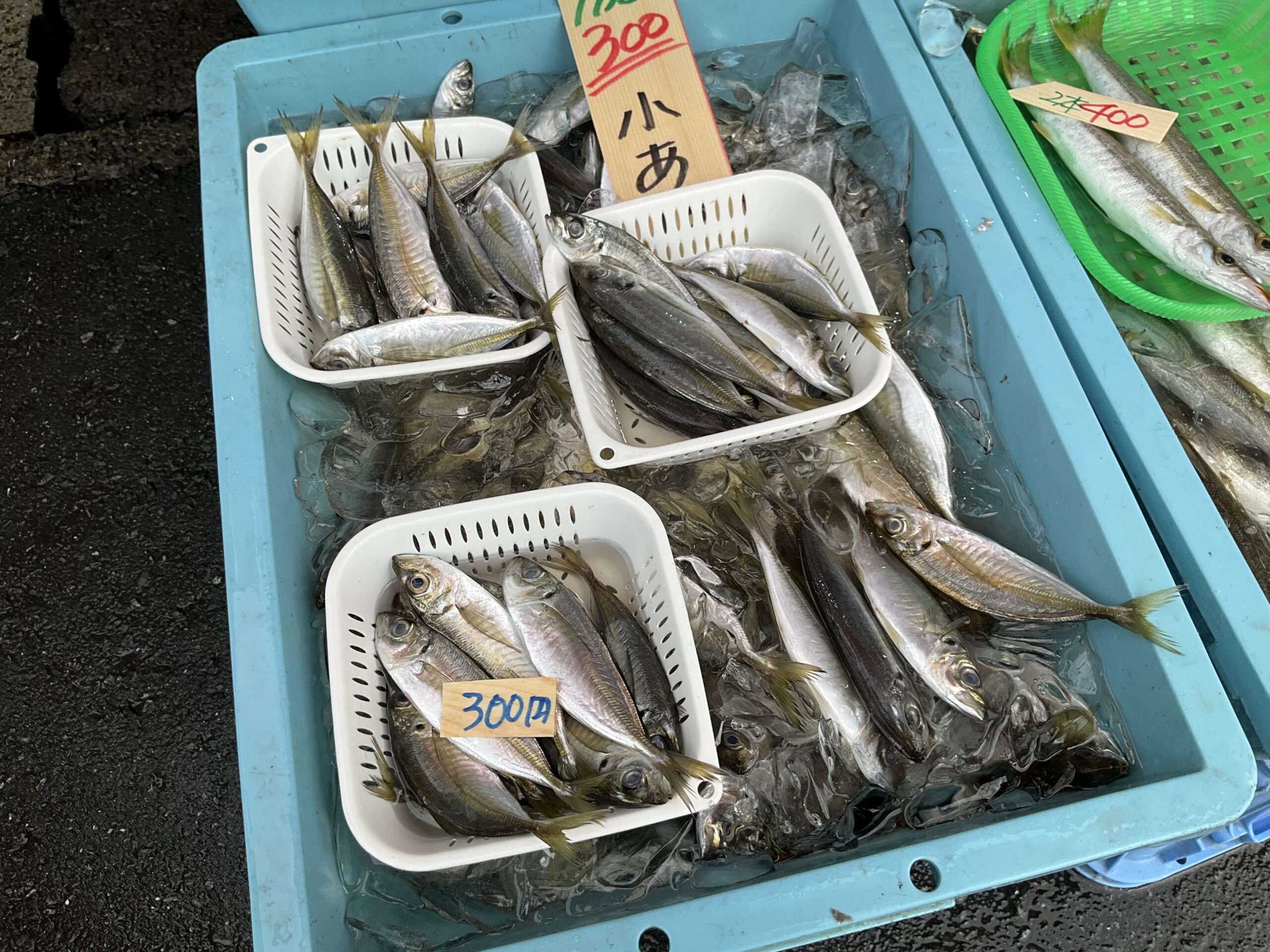 やはりマアジは少し大きいと3匹で700円。メアジなら良いサイズで4匹400円なのだけど。でもやはりマアジにしようと、少し小さいけど、まあ開いてアジフライには何とかできそうな、一カゴ300円を2カゴ。