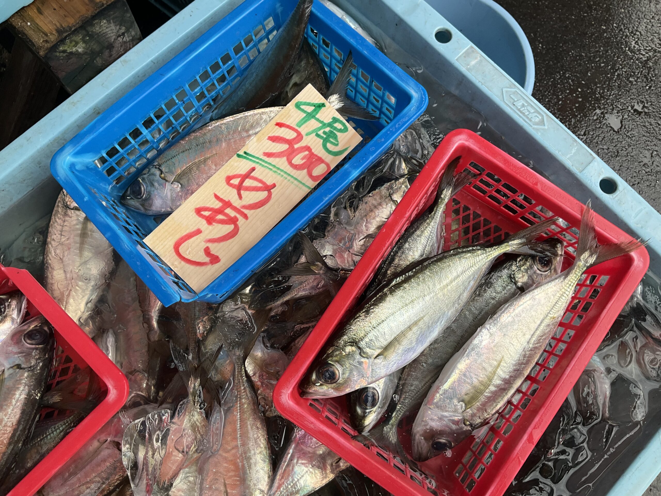 やはりマアジは少し大きいと3匹で700円。メアジなら良いサイズで4匹400円なのだけど。でもやはりマアジにしようと、少し小さいけど、まあ開いてアジフライには何とかできそうな、一カゴ300円を2カゴ。