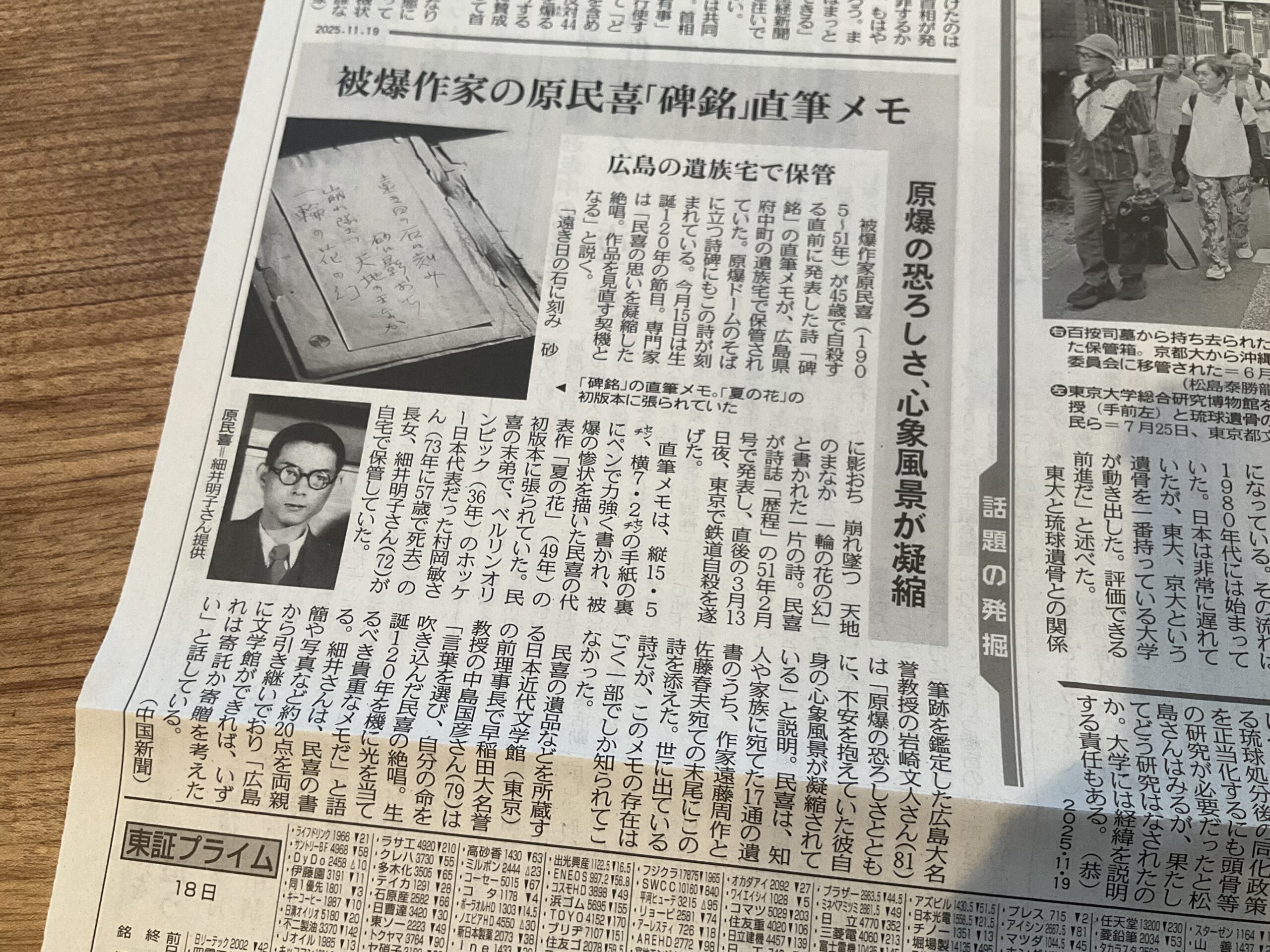それはさておき、今朝の新聞に大きく原民喜の記事が出ていた。広島で仕事をしていると原民喜とか峠三吉とか、否が応でも目にする名前なのだけど、全国的な知名度は現在においてどうなのだろう?東京の新聞で急にこんなに大きい記事を見て意外に感じた。いわゆる原爆作家で「夏の花」とか、被爆体験を綴った作品や詩を残した人だが、10年ほど前に不意打ちを喰らったことがある。