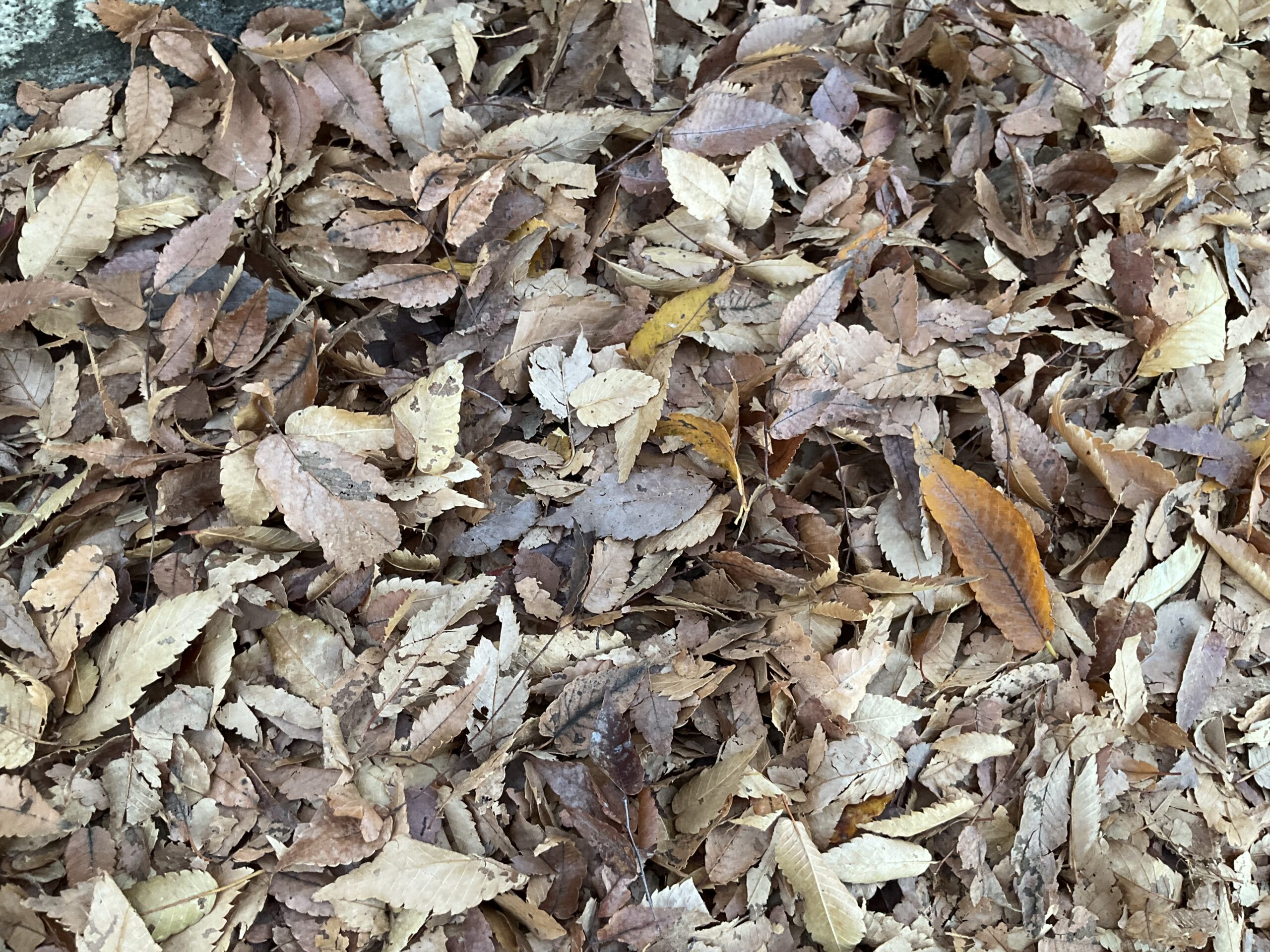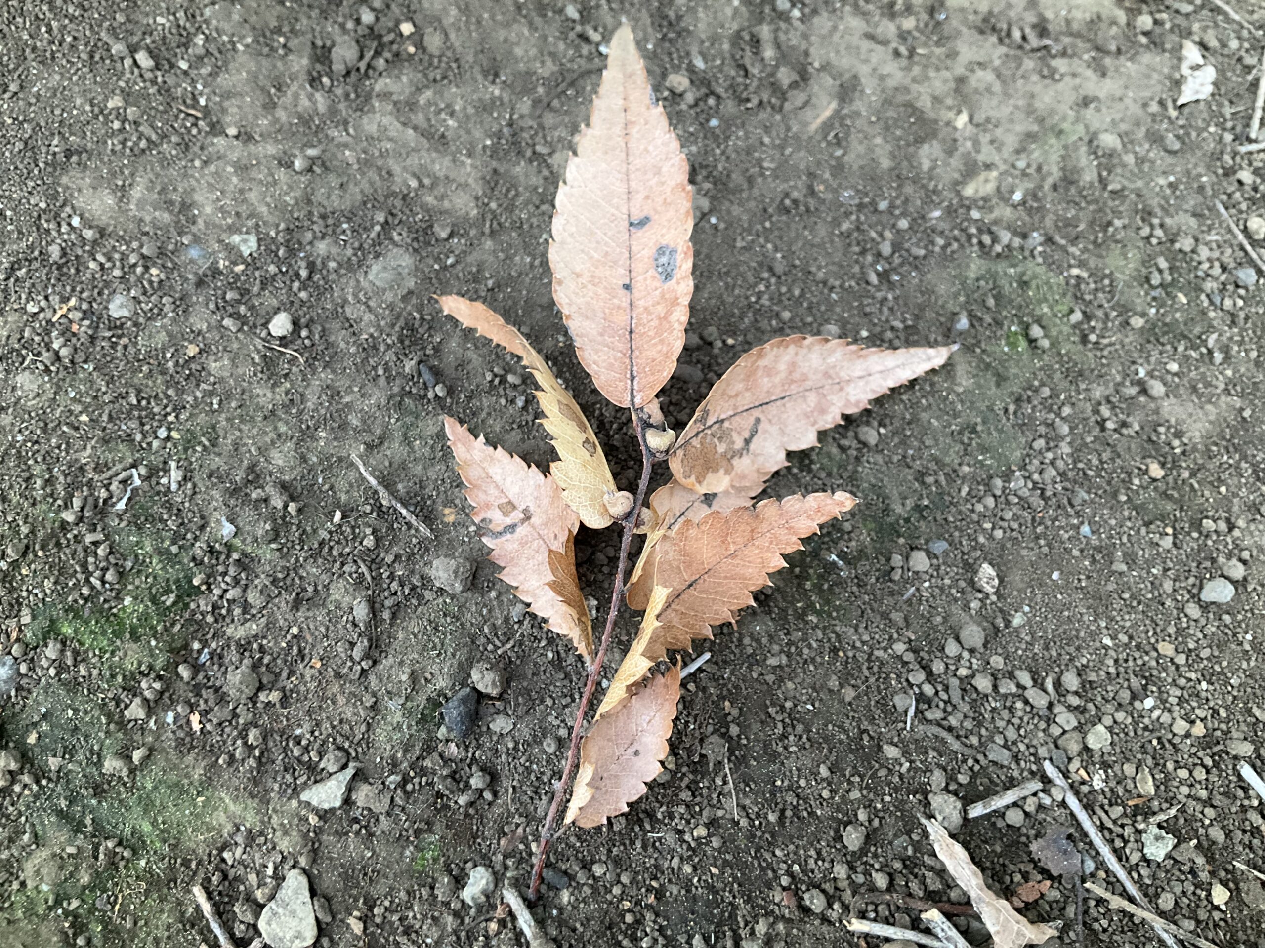 街はすっかり落ち葉の季節。ケヤキの葉が降り積もっている。この中に、一枚ずつ落ちている大きい葉と違って、枝ごと数枚で落下している小さい葉がある。それが着花短枝。(着果)葉の付け根に付いているのがケヤキの種。木枯らしに乗ってクルクル回って遠くまで飛んでいく。種を埋めて発芽させ、30年育てれば、きっと立派な盆栽になると思いますよ。