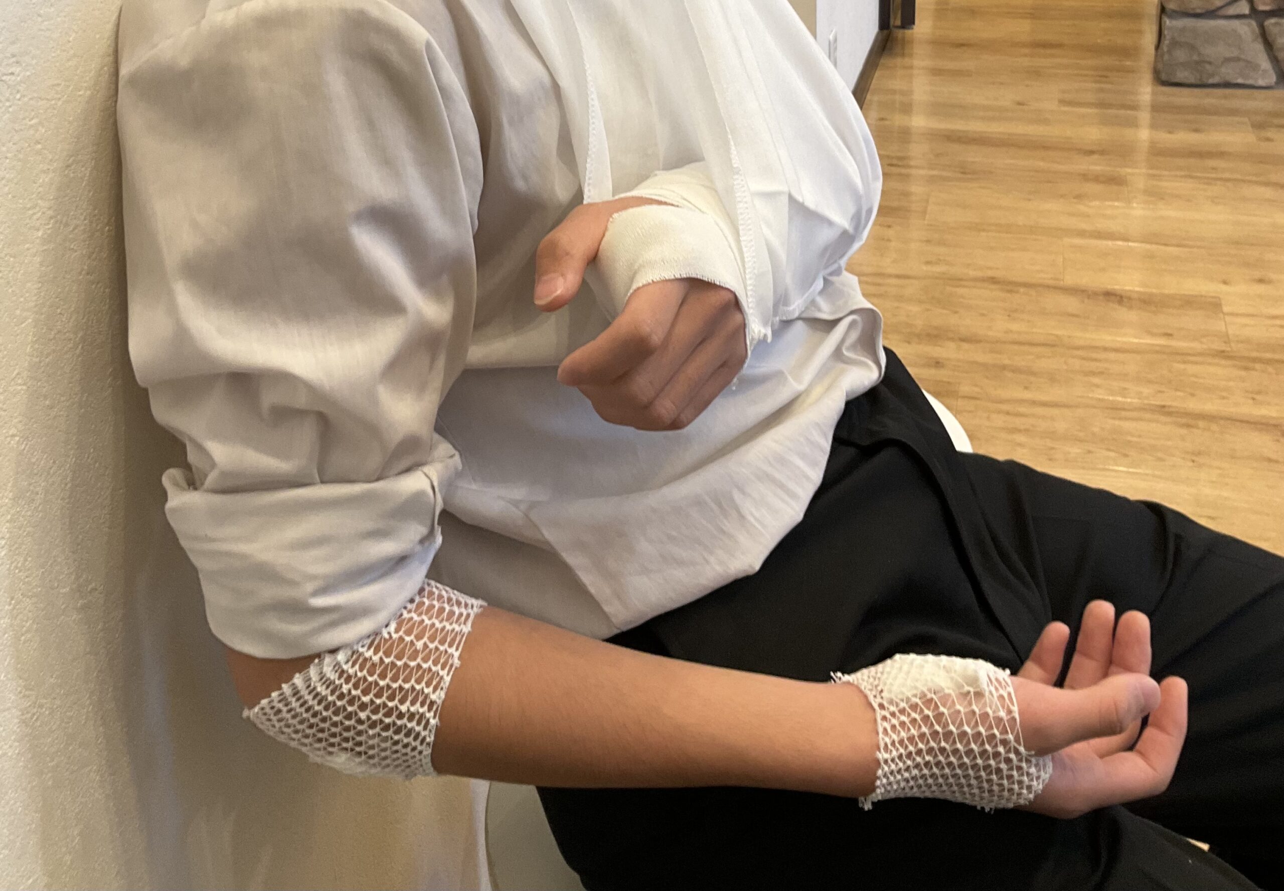 妻が車で出ているのでバイクで行くしかない。予備のヘルメット、そして打ったところはレントゲン取るなど整形外科の診察を受けないと。現場近くに整形外科がある。夏に骨折した長女がずっと通っていた病院だ。彼女が診察開始は8:45と教えてくれる。双子2号の保険証とか医療証を入れたセットを持ってとりあえず現場へ。行くと、近くのリハビリ施設の人が室内に入れてくれて傷の手当てをしてくれていた。両手の平に擦り傷があるが、打った右肘と左の手首が痛いということ。手首の方が大きく腫れている。これはヤバそう。状況は、歩いている人を追い抜こうと歩道の端の路肩みたいなところを迂回して、戻ろうとしたところ、段差でコケたらしい。まあ自爆だ。人に怪我をさせてないのは幸いだ。自転車と荷物を確認したが、バッグがアホほど重い。何が入っているのか知らないが、部活引退してるのにこんな重い荷物を自転車に積んでるのも一因じゃないだろうか?まず中学に連絡してから、自転車は置いたままにさせてもらって、バイクで整形外科へ。幸い、近くだ。朝の整形外科はリハビリなどの常連さんで開院前からいつも行列だが、怪我をしているのを見て、高齢者の方が順番を譲ってくれた。ありがたい。開院を待つ間に妻にLINEして、職場の上司に連絡。とりあえず出勤はやめて本日は在宅勤務に変更。PCは家に持って帰っているので大丈夫。