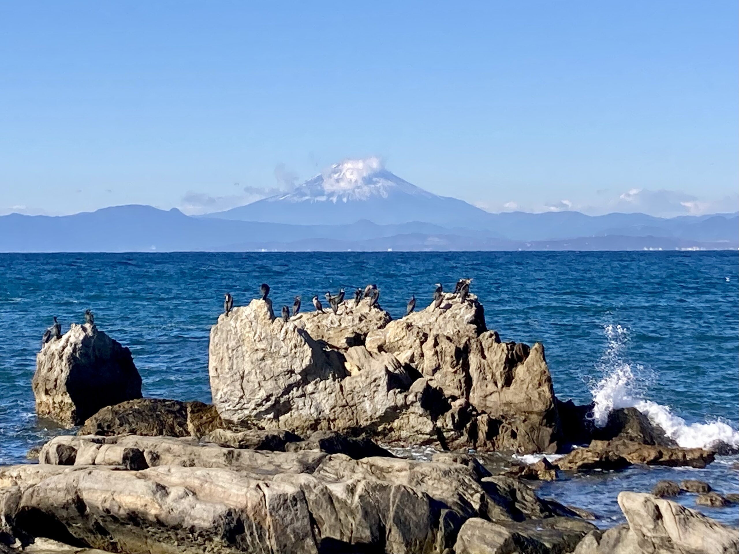 在宅勤務開始前のランニング中のショット。御用邸裏の小磯の鼻の岩場に多数のウ。カワウではなくウミウだと思うけど、距離があるので確信はない。別に富士山が入った写真をそれほど撮りたい気持ちはないのだけど、さあどうぞ、という位置にくっきり見えていると、どうしても背景に入れたくなる。逃れがたい富士山の魔力。かくして葉山に住んでいるとスマホの画像が富士山だらけになる。今日は快晴だけど、波は荒くて、岩に当たって白く砕けて飛沫が上がっていた。富士山と岩に砕ける波、という松竹と東映を合わせたような光景がこれからの季節はしばしば見られる。