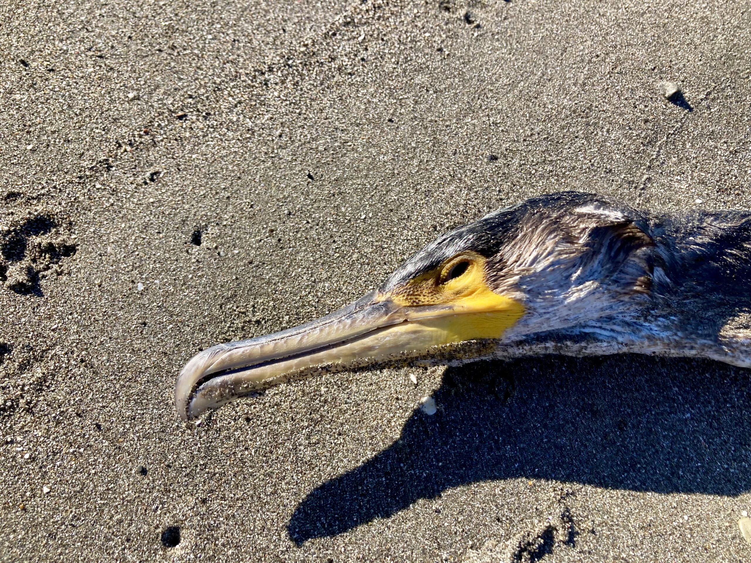 森戸海岸にはウの死体。浜に鳥の死体が打ち上げられていることはよくある。見つけたら、一応検分する。種類、変な死因の可能性、そして足に標識となる足環がついていないか。野鳥には環境省の委託で山階鳥類研究所から認定された調査員が毎年全国で多数を捕獲して足環を付けている。足環を付けた鳥がそのあと、いつどこで記録されるか?というのは、重要な情報なのだけど、足環を付けた鳥が再捕獲されたりする確率は非常に低く、データは放鳥数に対してとても少ない。また鳥は小さくて足環も小さいため、野外で金属製の足環を付けた鳥を観察者が発見しても、番号が読めるほど近づけないことがほとんどだ。でも死んでいる鳥なら、足環の番号はしっかり読める。だから、鳥の死体があったら、可能性は低いけど、必ず足環がついていないか、確認する。知り合いに標識調査員もたくさんいるし、若い頃、手伝いで私もかなりの数の鳥に足環を付けた身なので、これは癖みたいなもの。葉山でも一回だけ、足環を付けたウミネコの死体を見つけたことがある。死体と足環を写真に撮って山階鳥類研究所にメールで報告するととても感謝される。いつどこで捕獲された個体かも教えてくれる。点と点がつながり、貴重なデータの一つになるのだ。