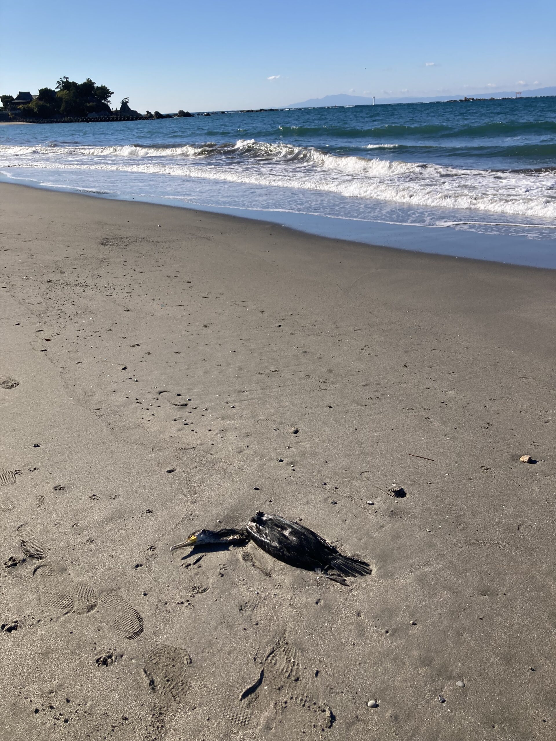 森戸海岸にはウの死体。浜に鳥の死体が打ち上げられていることはよくある。見つけたら、一応検分する。種類、変な死因の可能性、そして足に標識となる足環がついていないか。野鳥には環境省の委託で山階鳥類研究所から認定された調査員が毎年全国で多数を捕獲して足環を付けている。足環を付けた鳥がそのあと、いつどこで記録されるか?というのは、重要な情報なのだけど、足環を付けた鳥が再捕獲されたりする確率は非常に低く、データは放鳥数に対してとても少ない。また鳥は小さくて足環も小さいため、野外で金属製の足環を付けた鳥を観察者が発見しても、番号が読めるほど近づけないことがほとんどだ。でも死んでいる鳥なら、足環の番号はしっかり読める。だから、鳥の死体があったら、可能性は低いけど、必ず足環がついていないか、確認する。知り合いに標識調査員もたくさんいるし、若い頃、手伝いで私もかなりの数の鳥に足環を付けた身なので、これは癖みたいなもの。葉山でも一回だけ、足環を付けたウミネコの死体を見つけたことがある。死体と足環を写真に撮って山階鳥類研究所にメールで報告するととても感謝される。いつどこで捕獲された個体かも教えてくれる。点と点がつながり、貴重なデータの一つになるのだ。
