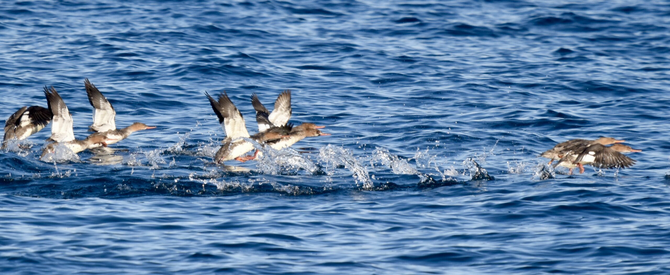 今日は芝崎海岸でウミアイサが南から飛んできて海面に降りたのを発見。その後、餌を求めて泳いで行くのを追って移動。しばらくして群れは飛び立ち、また昨日と同じ森戸神社裏の磯へ。私もそれを追ってバイクで移動。
