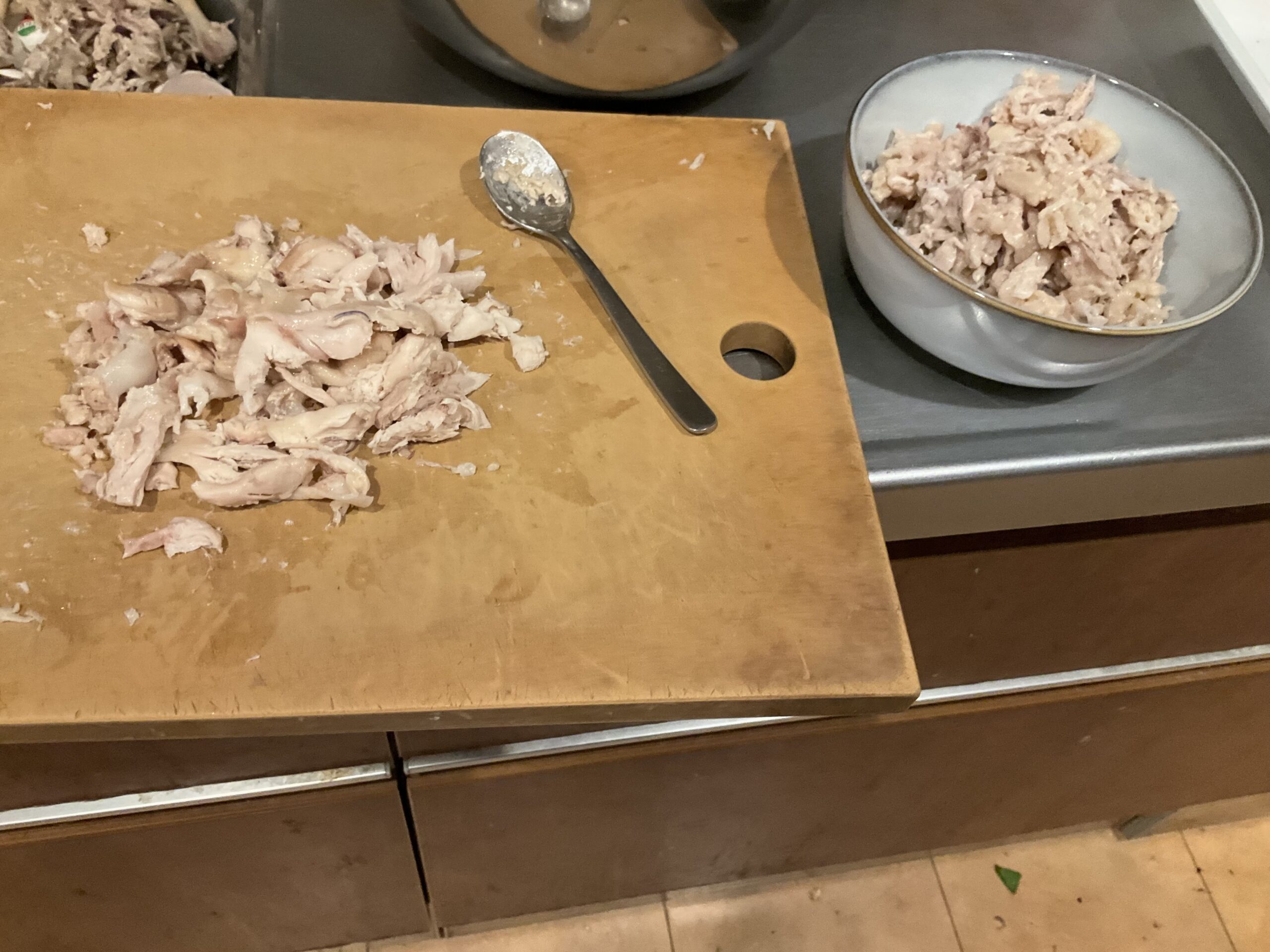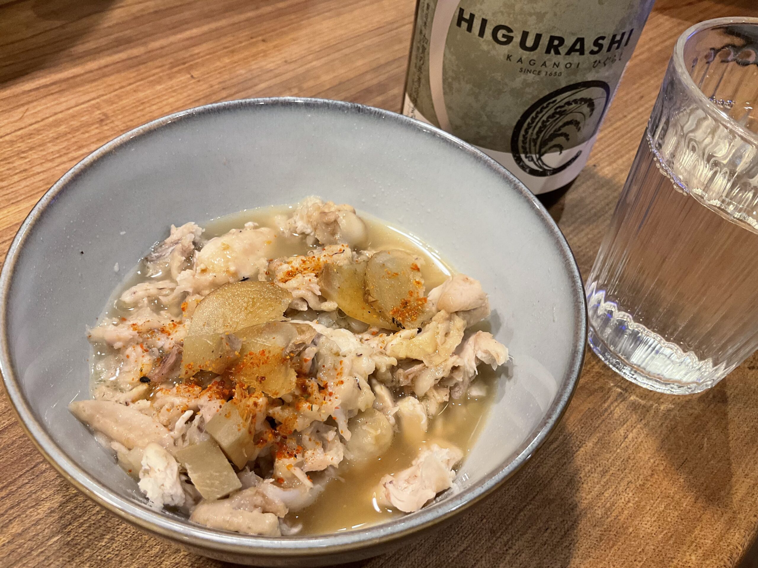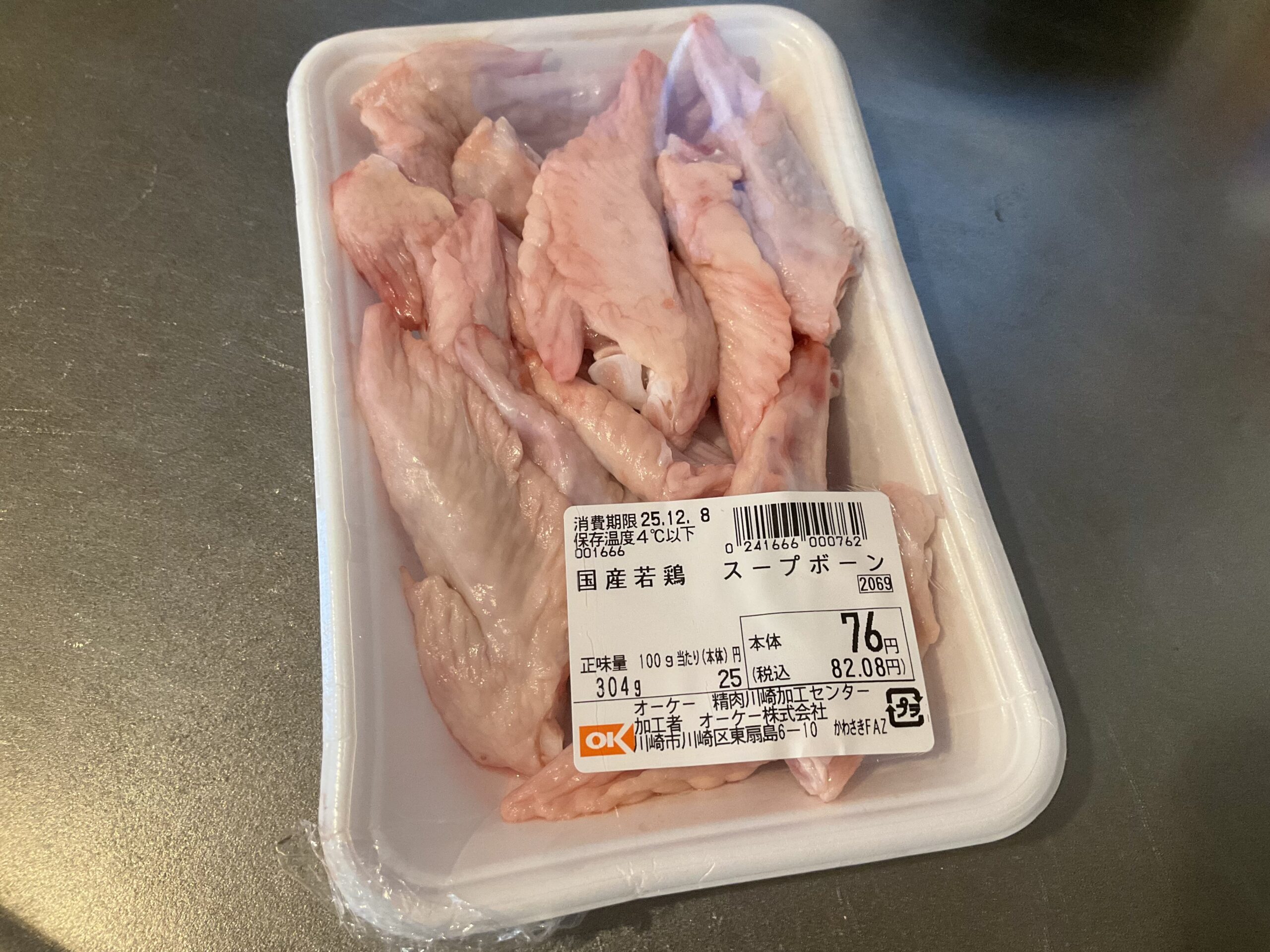 夕食とは別に、昨日オーケーで買ったスープボーンなる安い鶏肉で何か肴を作れないか?というトライアル。手羽先の細い部分、チップと言われる部位だ。手羽先を食べる時、私はこの部分も食べるので、これだけ安いなら工夫のしようによっては、またコスパの良い肴になるかも?と思った次第。手羽先の肉が付いている方は、半分に切って手羽中半割り、として売られている。最近は鳥スペアリブとかいう商品名でも売られている。食べやすいのであちらは人気。それを取ったあまりがこのスープボーンなのだろう。とりあえず煮込んでスープを取ってから、スプーンで皮と肉を削ぎ取ってみた。あまり皮ばかりだと嫌なので手羽元も2本。結果、結構な量の可食部が取れたけど、なかなか手間はかかる。徳島の焼き鳥屋のメニューにあった「鳥ホルモン」という感じをイメージしてるんだけど、ちょっと離れたものになった。