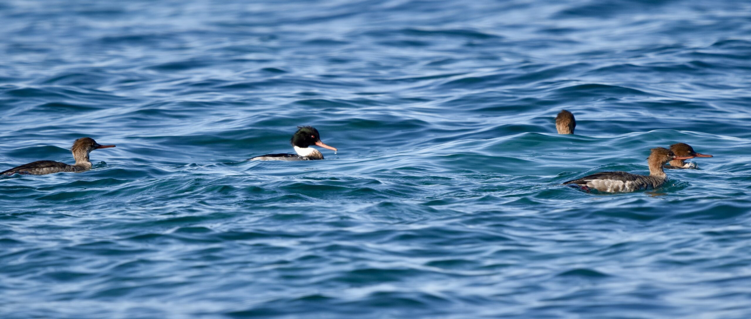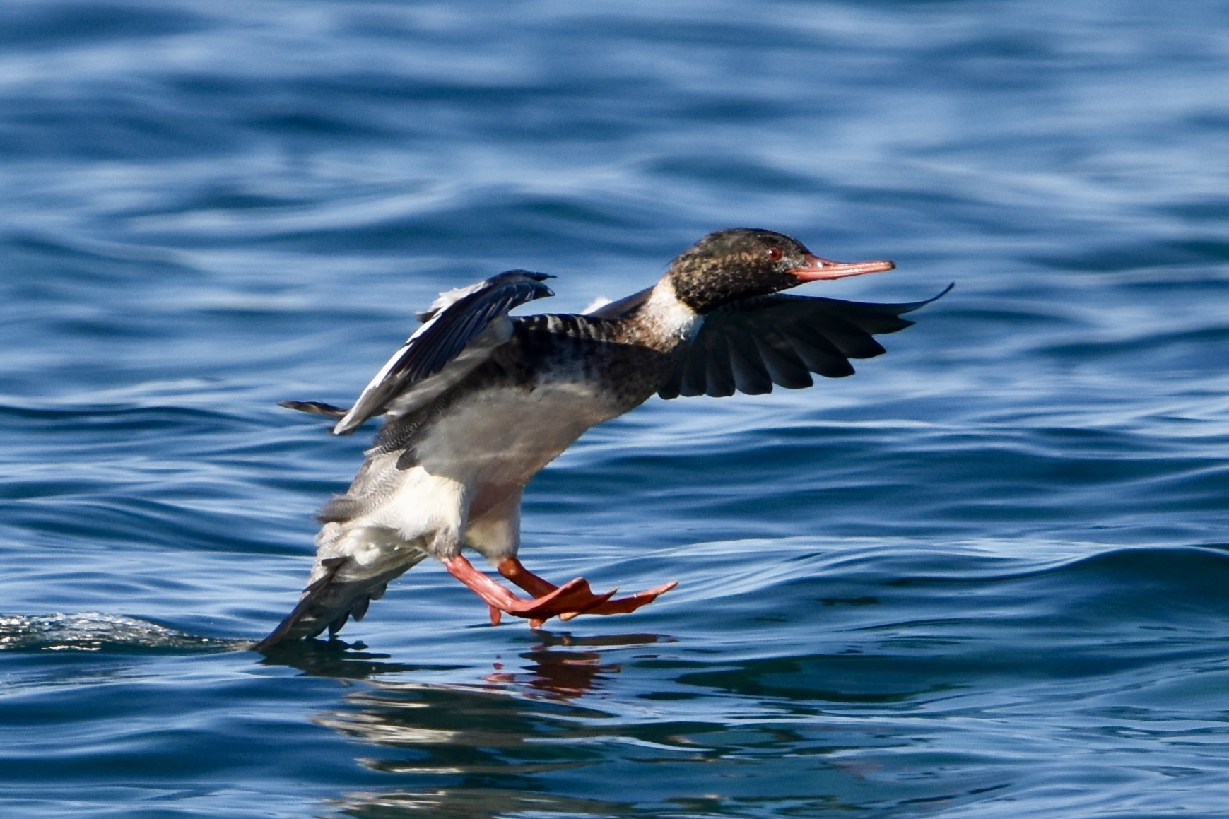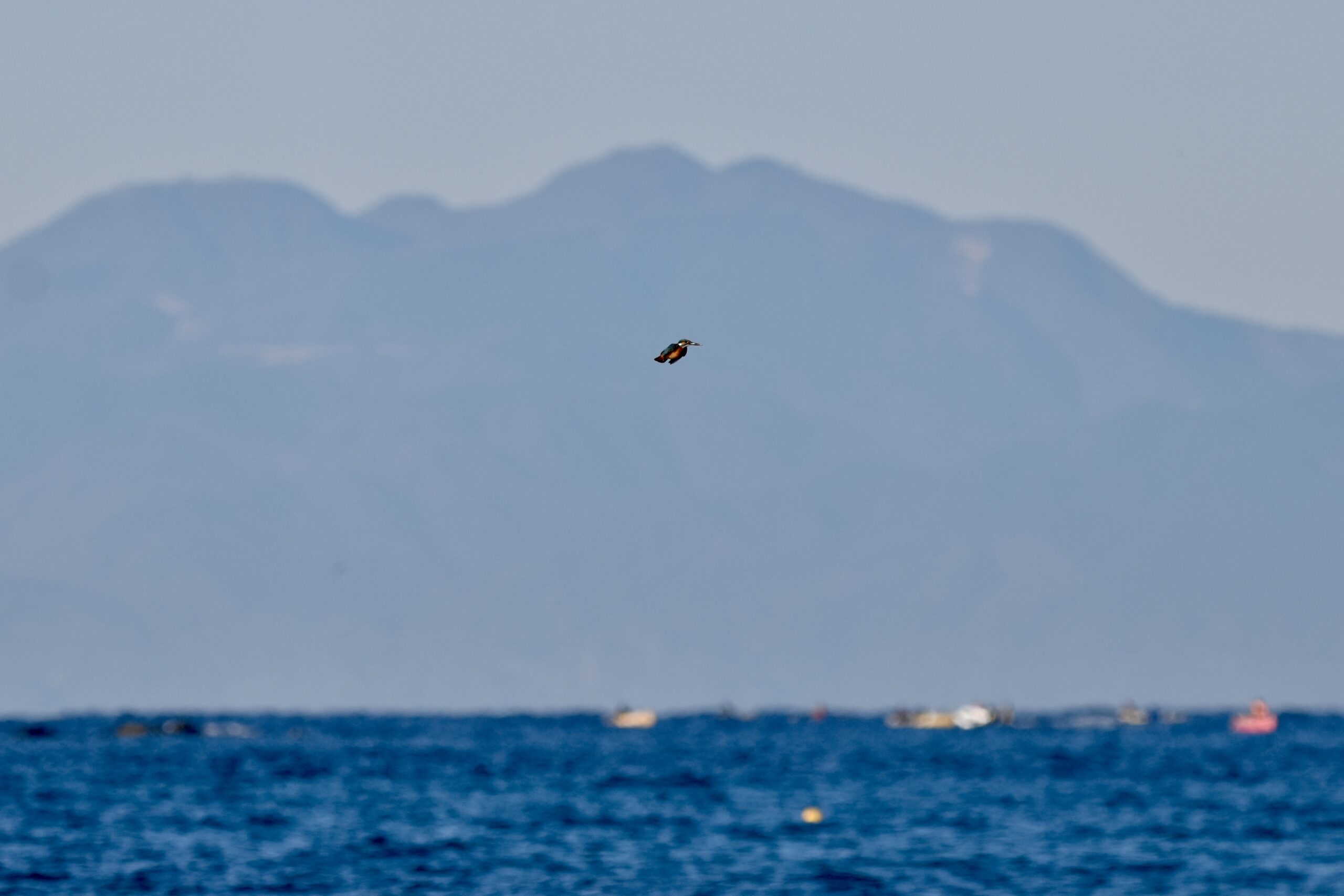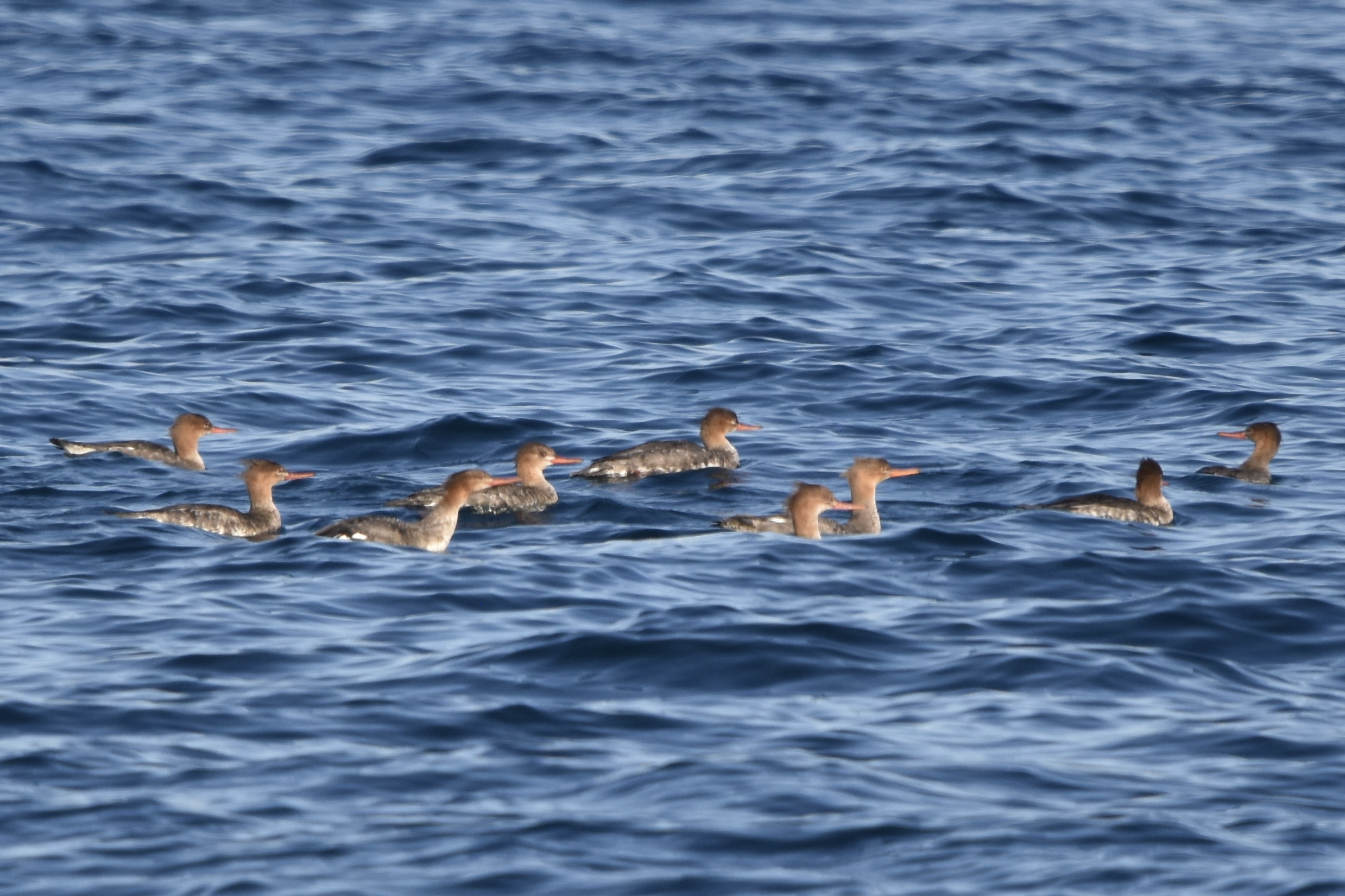 今日は芝崎海岸でウミアイサが南から飛んできて海面に降りたのを発見。その後、餌を求めて泳いで行くのを追って移動。しばらくして群れは飛び立ち、また昨日と同じ森戸神社裏の磯へ。私もそれを追ってバイクで移動。