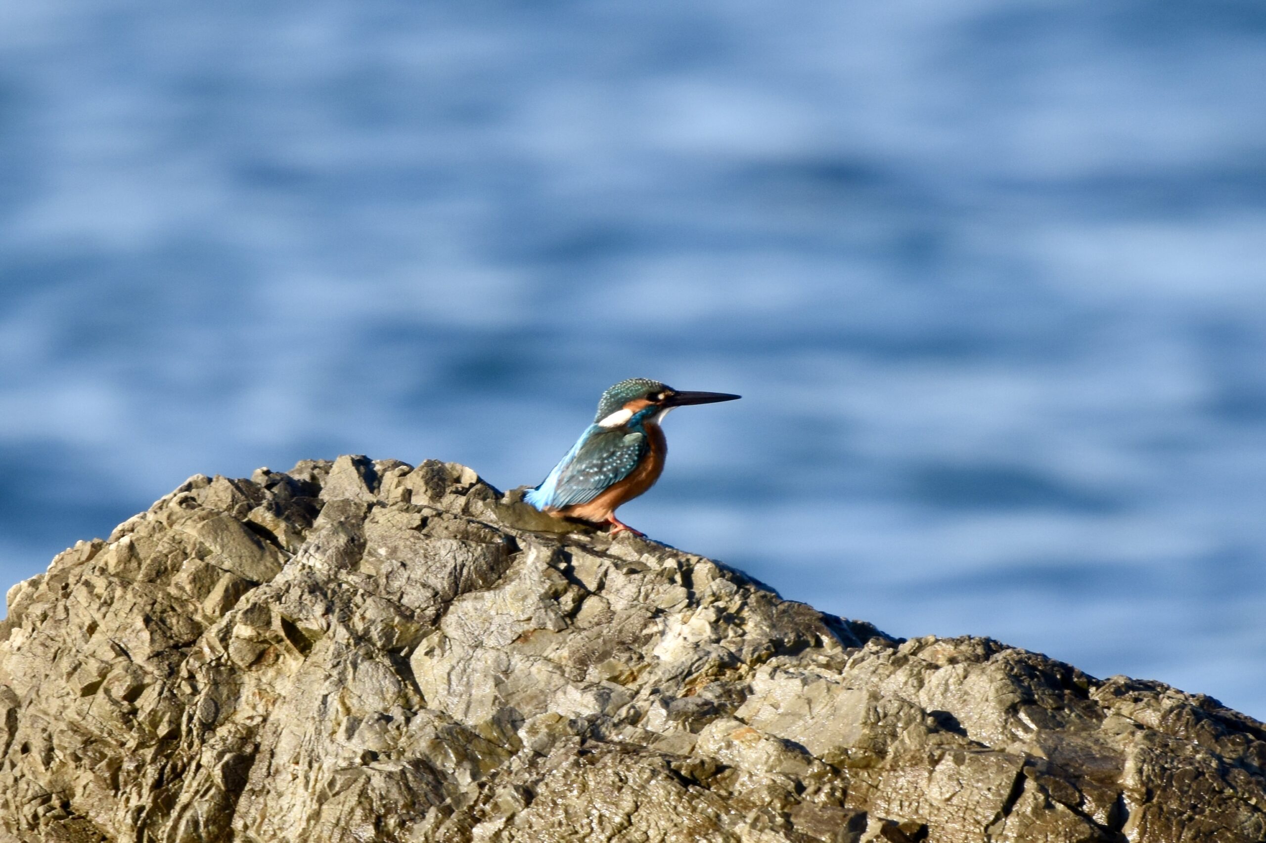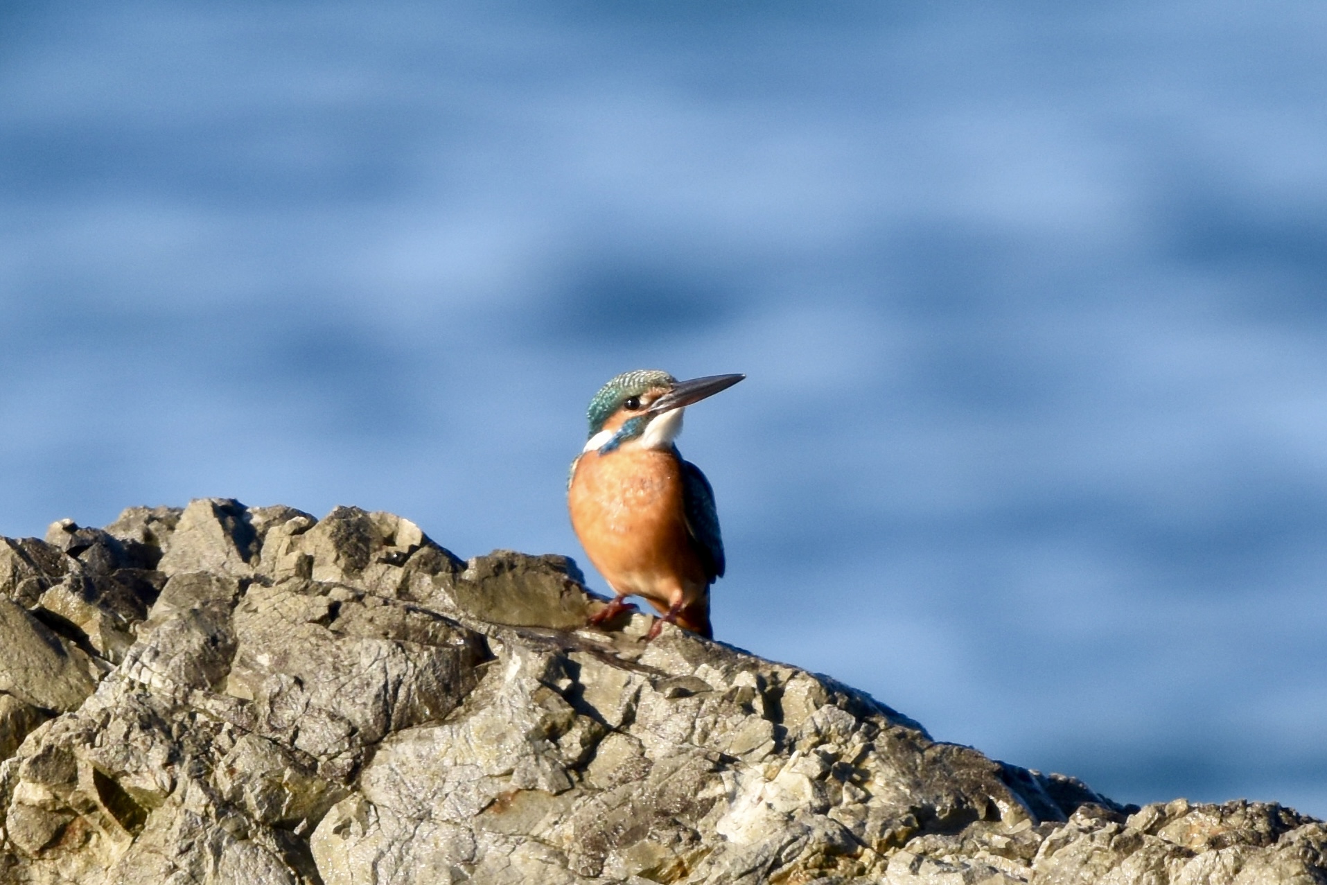 昨日は寒いし、光線も悪かったけど、今日は光もいいし、日差しが温かい。ウミアイサはまだ沖の方にいるので接近を待っていると、すぐ近くにカワセミが。基本的には川とか池とか淡水の鳥だけど、冬は海岸に出てきて、「海セミ」をしているのもよく見かける。実は昨日もいたけど、光線が悪いので撮影しなかった。今日は天気もいいので、少しカメラを向けてみる。頭から水中にダイブして魚を捕えるカワセミ、川では護岸とか木の枝から飛び込むことが多いが、海では、磯の岩では狙いが付けられないようで、海上で盛んにホバリングして獲物を見定めている。カワセミはスズメくらいしかない小さい鳥なので、広い海の上でホバリングしていると、なんだか心細気。