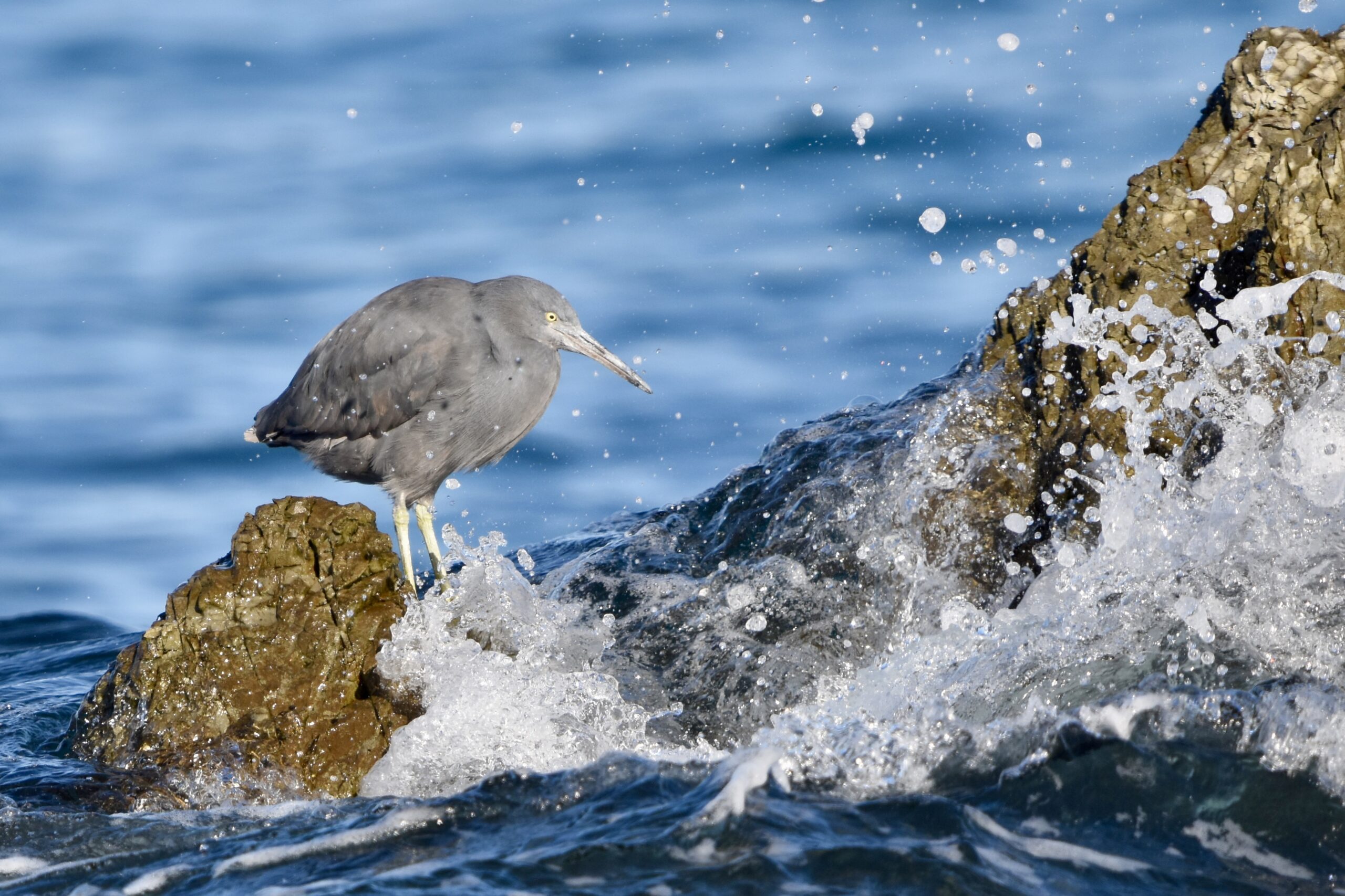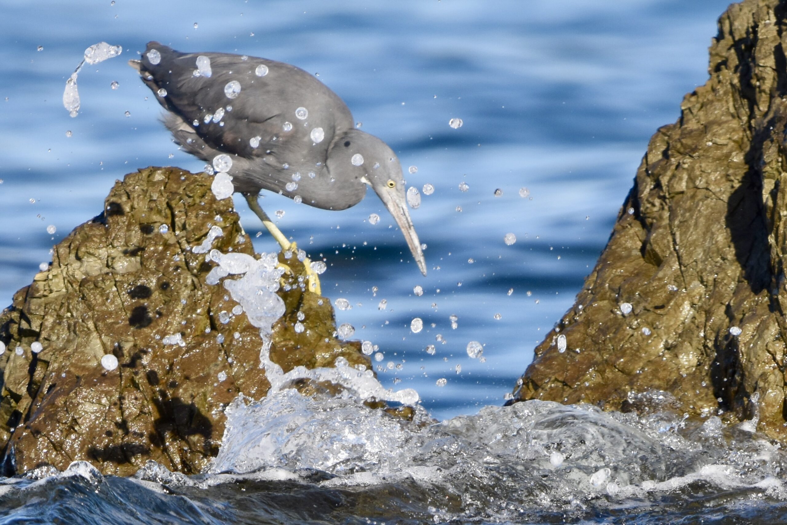 カワセミは結局魚は獲れず、もっと沖の岩に飛んでいった。それと入れ替わるように今度は目の前にクロサギ。波しぶきが上がるタイミングで狙ってみる。まあまあかな。このあとウミアイサの群れも岸に接近してきたのだけど、今日はあまり良いシーンが展開しなかった。腕の問題かな。でも日差しの下で望遠レンズを持って右に左に動き回っていたら汗をかくほどで、楽しかった!完全に鳥写真日記と化しているな。興味のない方は読み飛ばしてください。(笑)