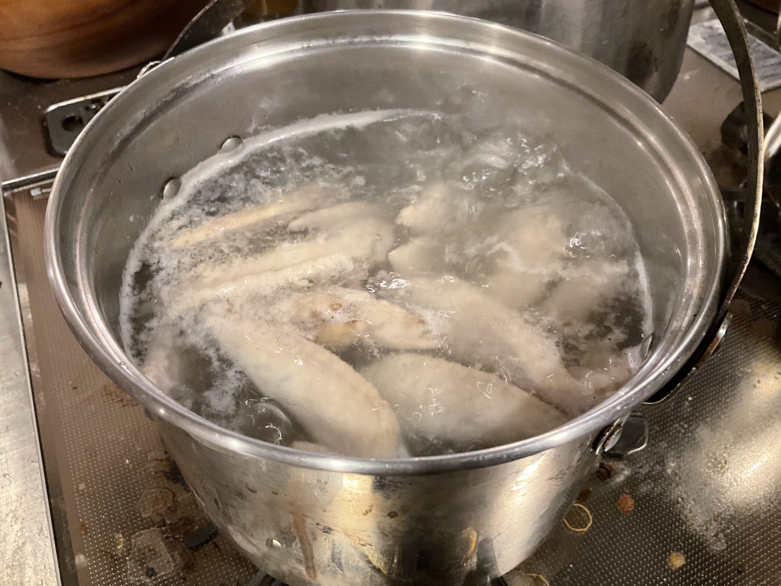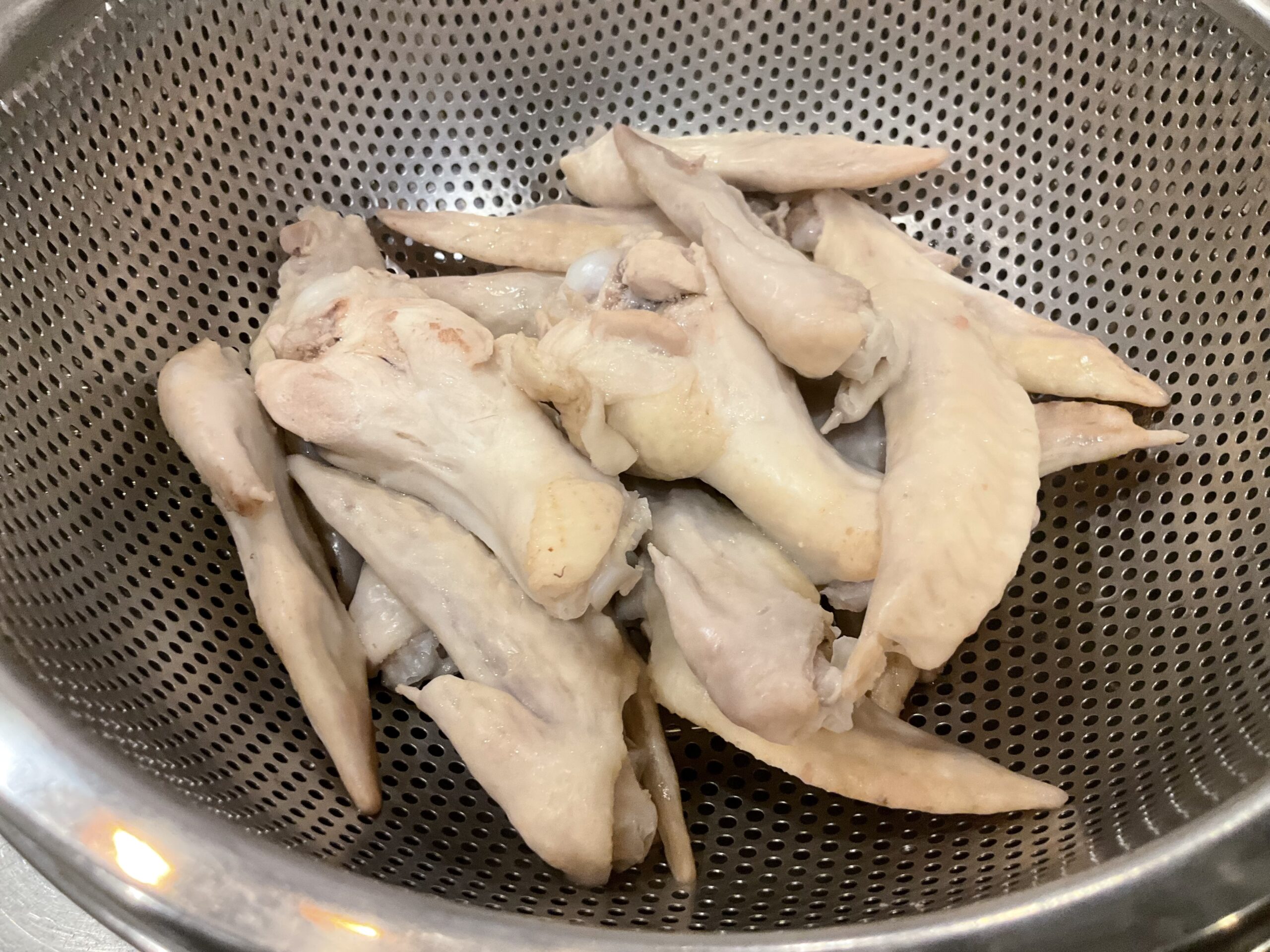 夕食とは別に、昨日オーケーで買ったスープボーンなる安い鶏肉で何か肴を作れないか?というトライアル。手羽先の細い部分、チップと言われる部位だ。手羽先を食べる時、私はこの部分も食べるので、これだけ安いなら工夫のしようによっては、またコスパの良い肴になるかも?と思った次第。手羽先の肉が付いている方は、半分に切って手羽中半割り、として売られている。最近は鳥スペアリブとかいう商品名でも売られている。食べやすいのであちらは人気。それを取ったあまりがこのスープボーンなのだろう。とりあえず煮込んでスープを取ってから、スプーンで皮と肉を削ぎ取ってみた。あまり皮ばかりだと嫌なので手羽元も2本。結果、結構な量の可食部が取れたけど、なかなか手間はかかる。徳島の焼き鳥屋のメニューにあった「鳥ホルモン」という感じをイメージしてるんだけど、ちょっと離れたものになった。