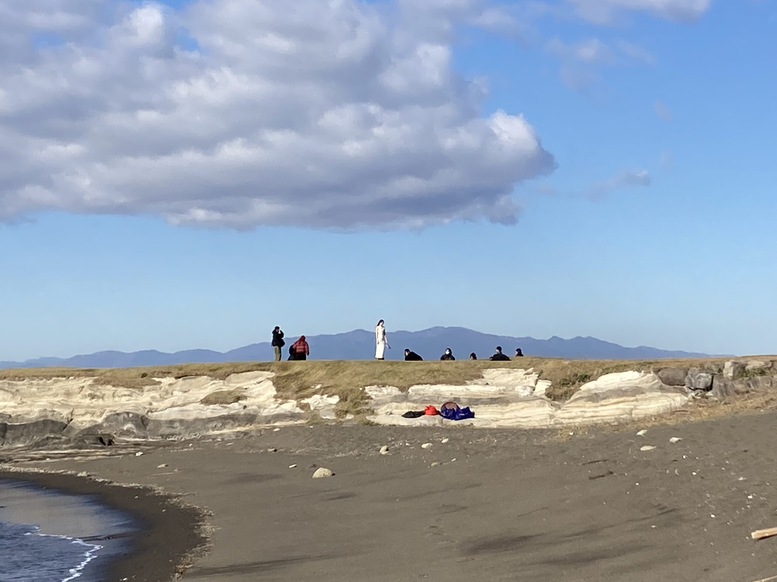 そんな中、小磯の鼻でなんかの撮影。この辺りでは映画やドラマ、CM、グラビアとかの撮影は海岸で年柄年中、行われている。あと、昼のワイドショーのお店紹介とか。鎌倉逗子葉山界隈の店紹介みたいなのは、毎日どっかしらのチャンネルで見るくらい。ネタがある程度多いこともあるのだろうけど、単純に東京から日帰りで撮影ができることが大きな理由だろう。タレントやスタッフの宿泊が必要になるロケ地は、手配の手間と経費が跳ね上がる。プロデューサーの立場で考えれば、日帰りで済む企画は圧倒的に楽だ。にしても、何の撮影かは分からなかったけど、ダウンやコートを着込んだスタッフに囲まれて、寒風の中、一人ノースリーブの女性、寒そう。