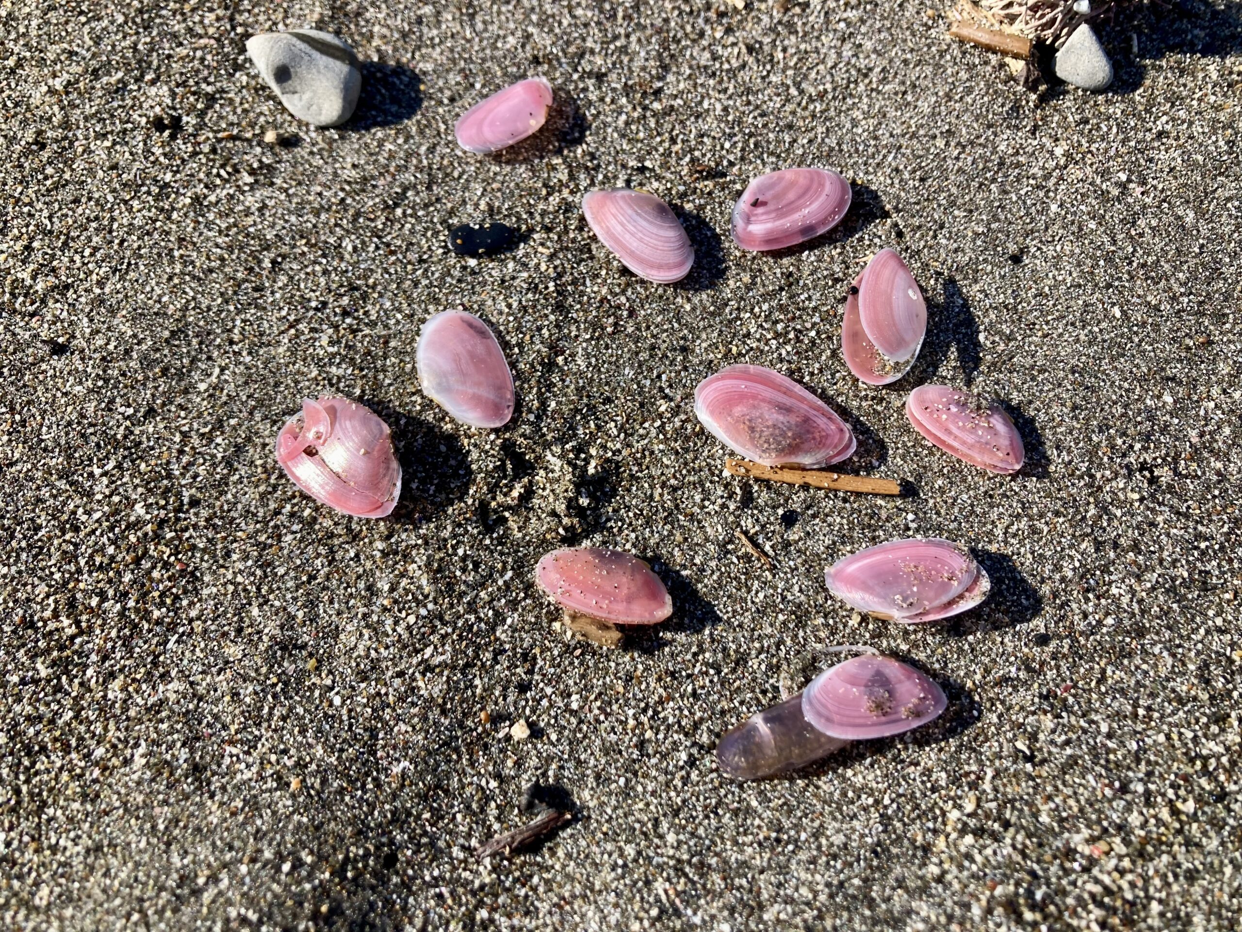 海が荒れていて森戸海岸の浜には石や貝殻の漂着物がたくさん。今日はその中にピンクのいわゆるサクラガイがたくさん混じっていた。ビーチコーミングをする人にとっては、ゲットするアイテムなのだろうか?濃いピンク色が鮮やか。サクラガイと言われる仲間は何種類かあるようだが、ざっと調べた限り、オオモモノハナという種類の貝ではないかと推測。