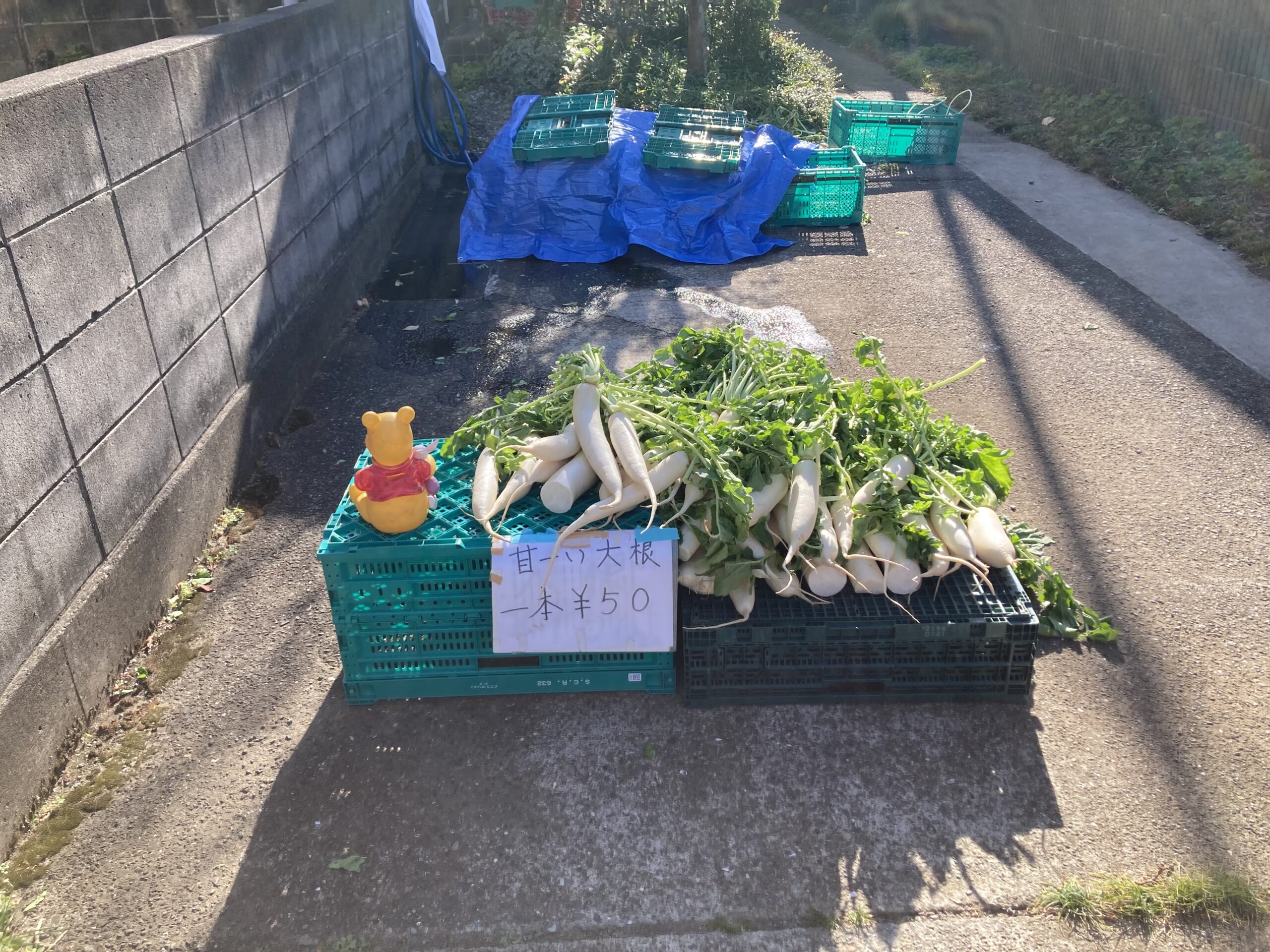 町内のご近所さん、娘さんが三浦の農園、というお宅でそこの野菜を冬になるとよく無人販売している。規格外と思われる野菜は格安だったりして我が家はよく買う。今日は小さい大根が50円。家に戻って妻に報告すると「10本!」ということで、プーさんのお金入れに500円投入して10本お持ち帰り。