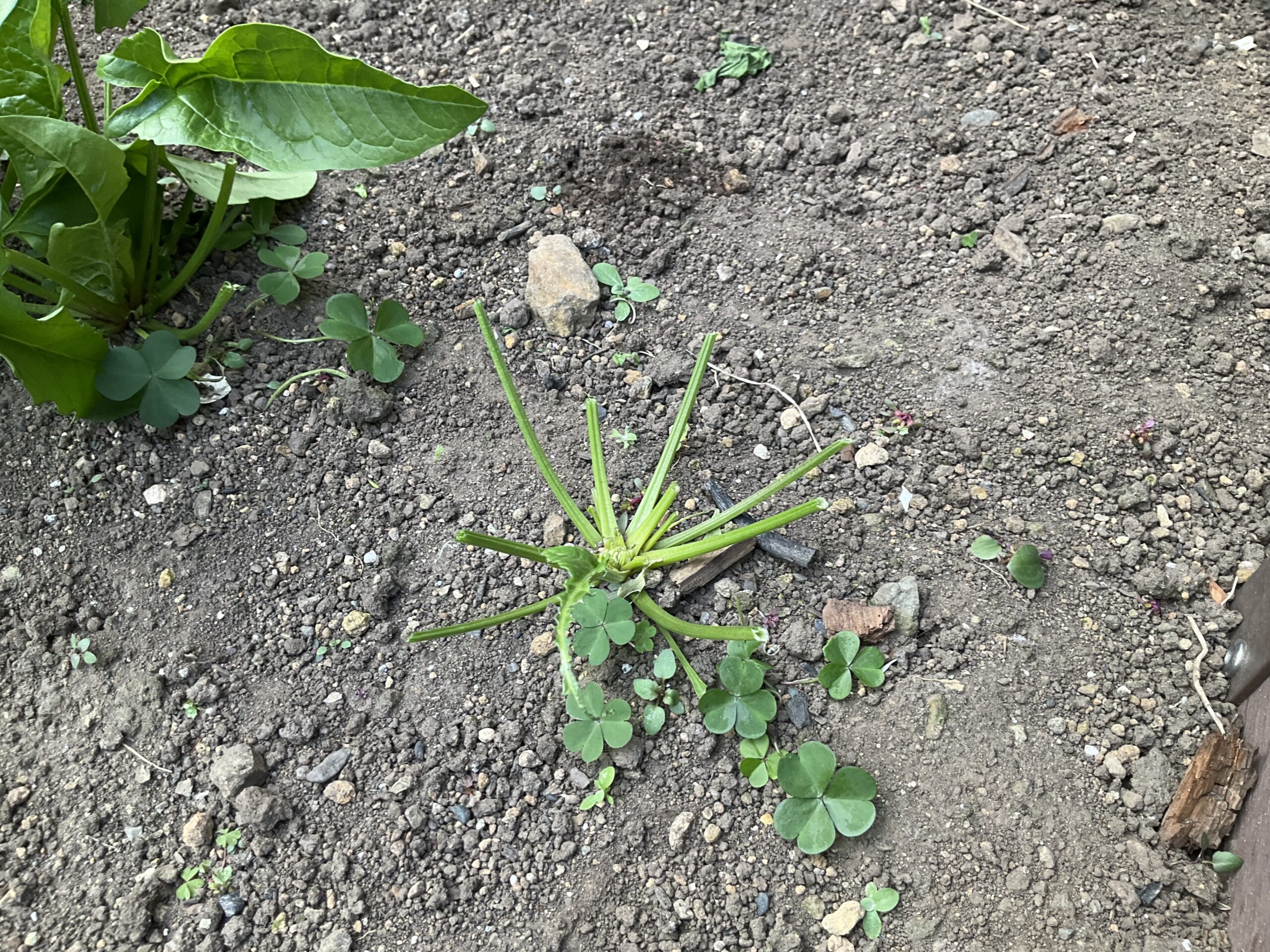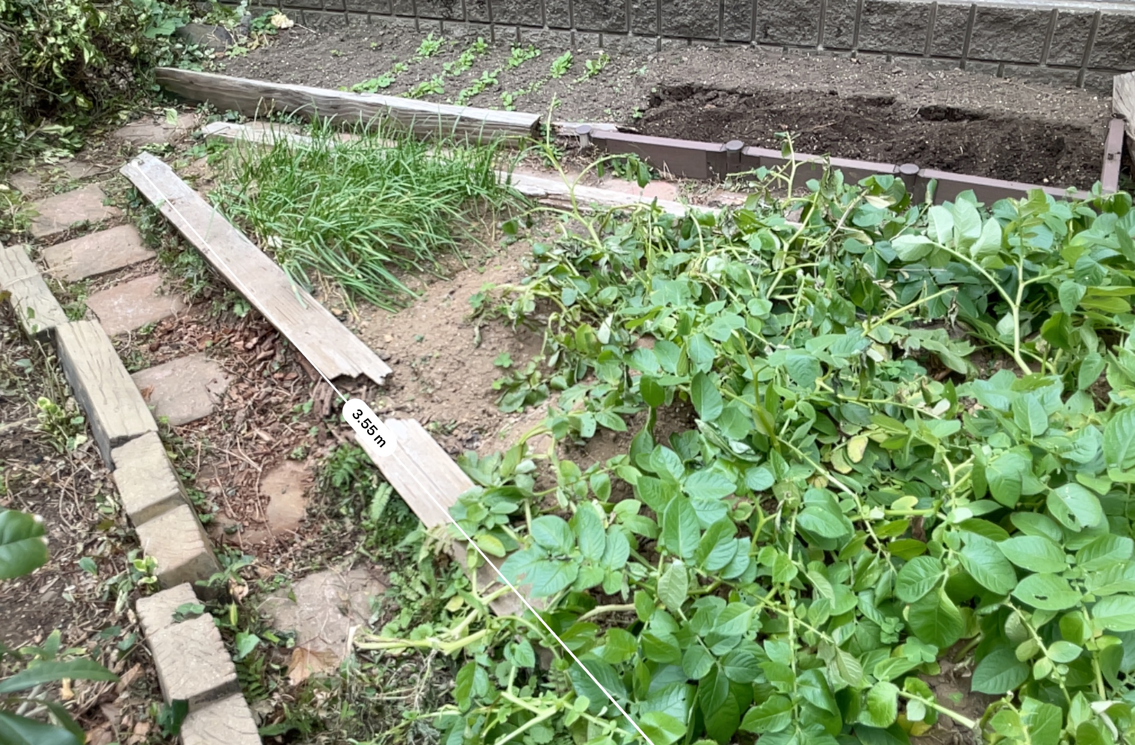 庭の畑、ジャガイモはまだ葉が枯れていないので収穫はもう少しあとかな。それはともかく、畑を囲んでいる木材がほぼ腐っていて、修繕が必要な状態になっている。