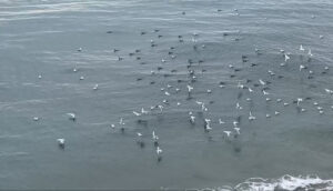 ウミアイサには帰途の長者ヶ崎で出会えた。曇り空の下、今日もユリカモメと一緒に魚群を追っていた。今日の群れは50羽ほど。餌を追う時の群れの結束は強いが、常に固定された個体で集団を作っているわけではない様で、観察していると、数羽が遠くから飛んできて群れに加わることがしばしばある。どういう集団行動原理になっているのか、知りたいところ。