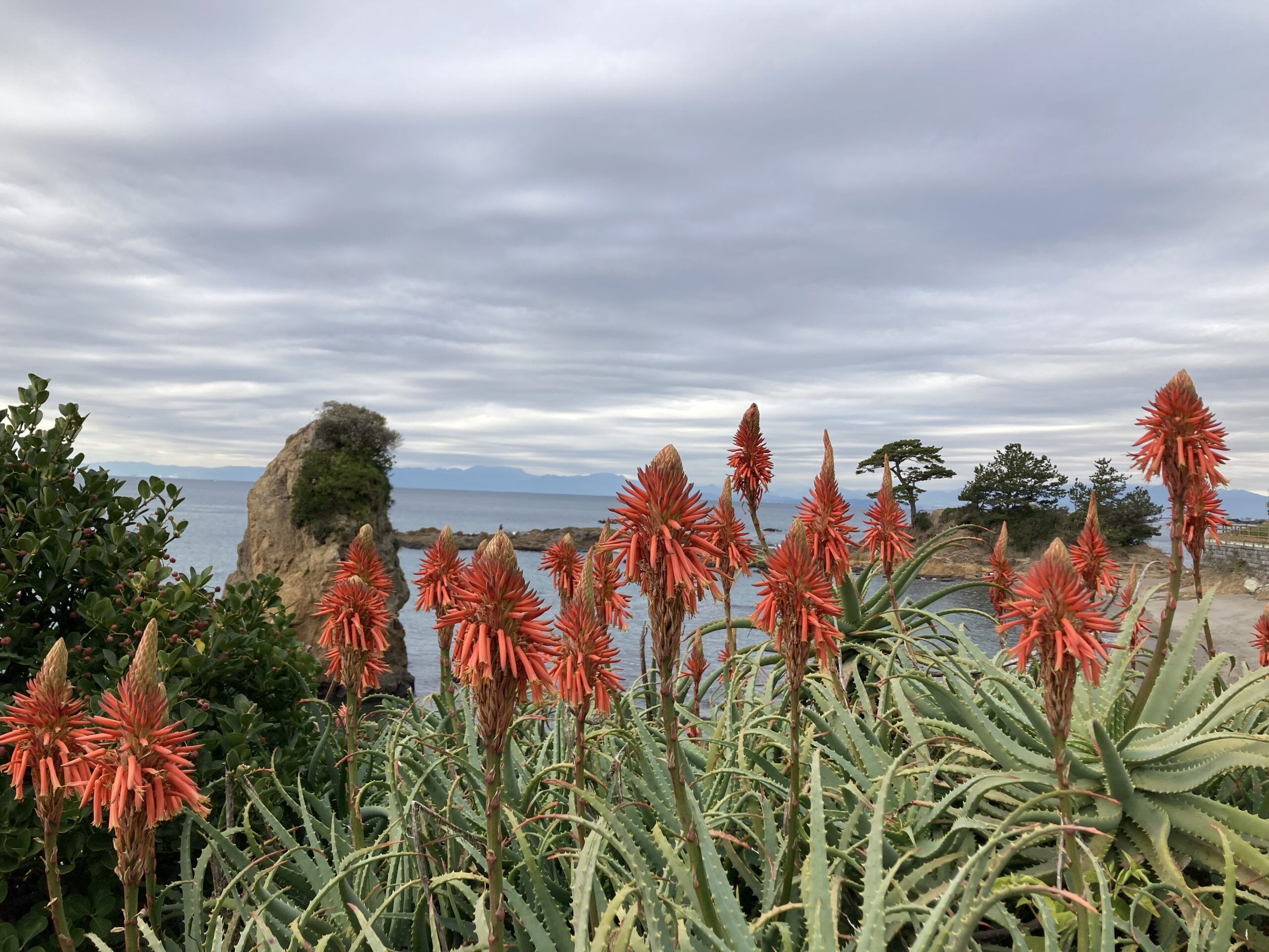 立石海岸で8月から咲き、まだ数株が粘っていたハマカンゾウがついに花がなくなり、アロエが満開。