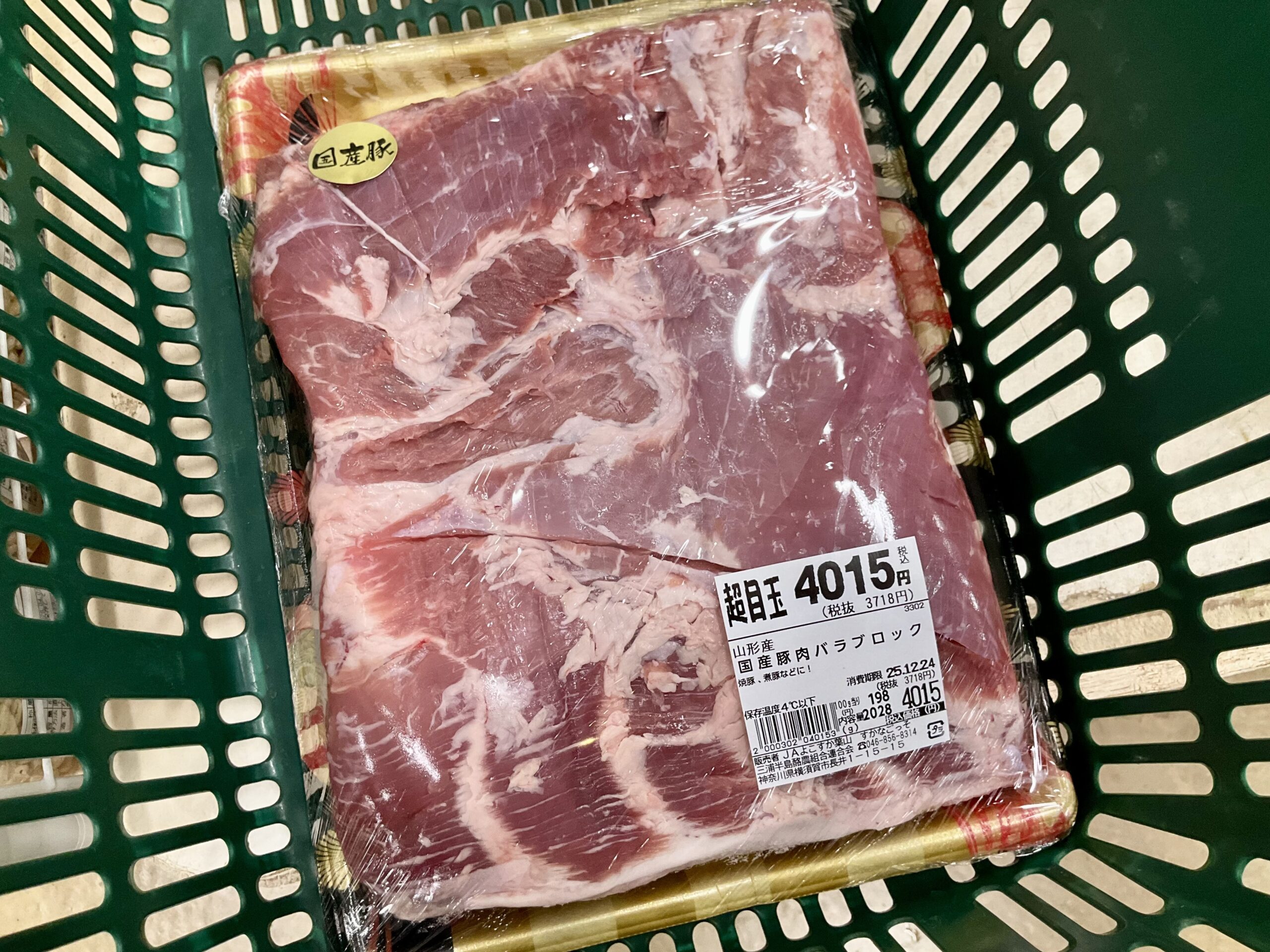 農協の野菜直売店「すかなごっそ」に入っている肉屋。どーせ作るなら手間は一緒なので、デカい方がよかろう、と2キロくらい作ることにしている。そんな大きい豚バラ肉の塊は店頭に普通並んでいないのだけど、ここの肉屋は頼むと、すぐにいい大きさに切ってくれる。まあどこの肉屋でもそうだと思うけど、ここは何となく頼みやすい。