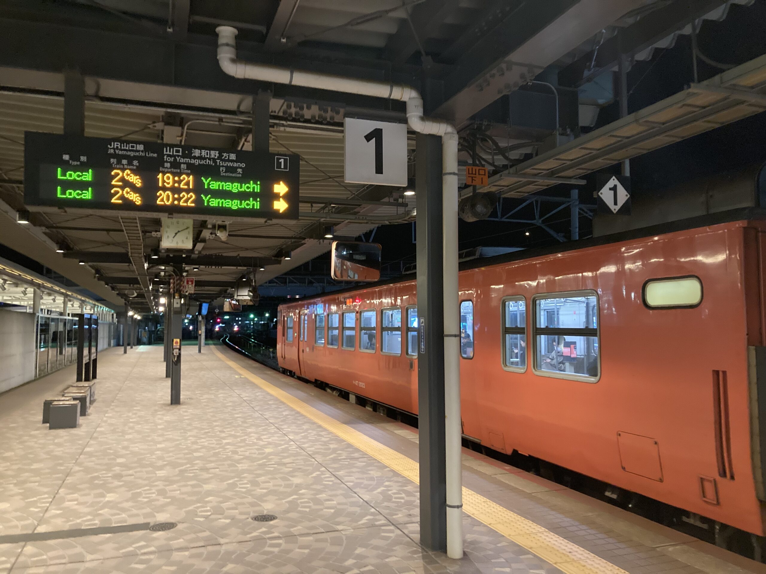 新山口に18:33に着いたものの、次の山口行きの山口線の列車は19:21発。何!?さすが山口。名古屋から岐阜や津へ行くのとはちょっと訳が違った。ようやく出発した列車に乗る。泊まるホテルは山口の一個手前、湯田温泉駅が最寄りのよう。そこから徒歩15分くらい。いつものようにスマホの地図アプリで目的地を入れて歩き始めたのだけど、見事に真っ暗。街灯がほとんどない。こんなに暗い道を歩いたのは久しぶりかも。暗すぎて途中で一回道を間違えた。スマホは真っ直ぐ進む道を表示していたのだけど、暗すぎて私にはその細い道が見えなかったのだ。目は良いし、夜目も効く方だと思っているけど、こういうことは珍しい。スマホに歩かされた道は墓地の脇の幅1メートルほどの裏路地だった。子どもや女性はやめておいた方がいい感じの道だった。