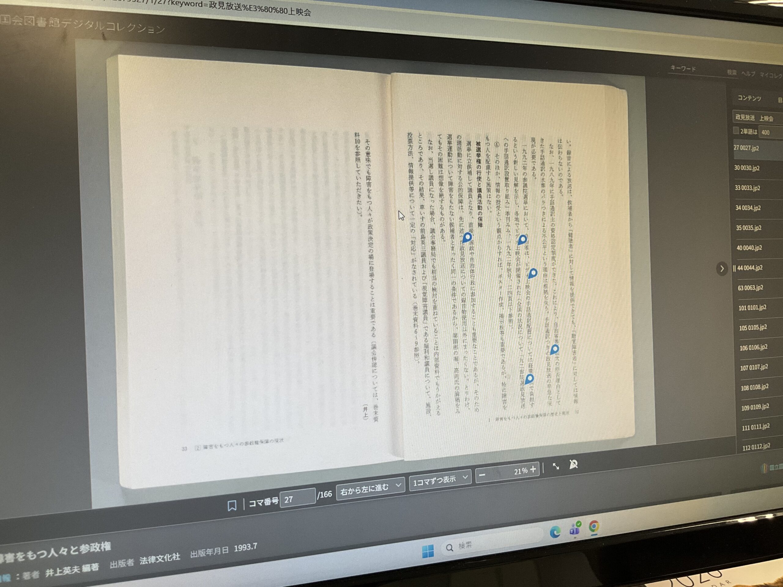 ただプロジェクト内に資料がないので詳しいことは・・・というのが、実情だったのだけど、ここで例の、国会図書館デジタルコレクション。個人的には今年最大の収穫かも。要望に含まれていた関連キーワードを入れると、過去の文書がゴロゴロ出てくる。書籍はもちろんだが、行政文書、自治体の報告書、そして福祉の専門雑誌の記事とか。この手のものは基本的にオンラインで本編が読める。そして検索すると、書籍名の下に、キーワードが出てくるページが表示されており、クリックするとそのままページに飛べて内容が読める。本編は書籍を撮影した画像だが、その画面上にちゃんとキーワードの場所を示すマーキングがされている。そして必要なページを指定すればPDFファイルを生成してくれる。マジで神。おかげで1990年代初頭からの、この問題の歴史や経緯がつぶさに分かる「古文書」を大量にサルベージできた。