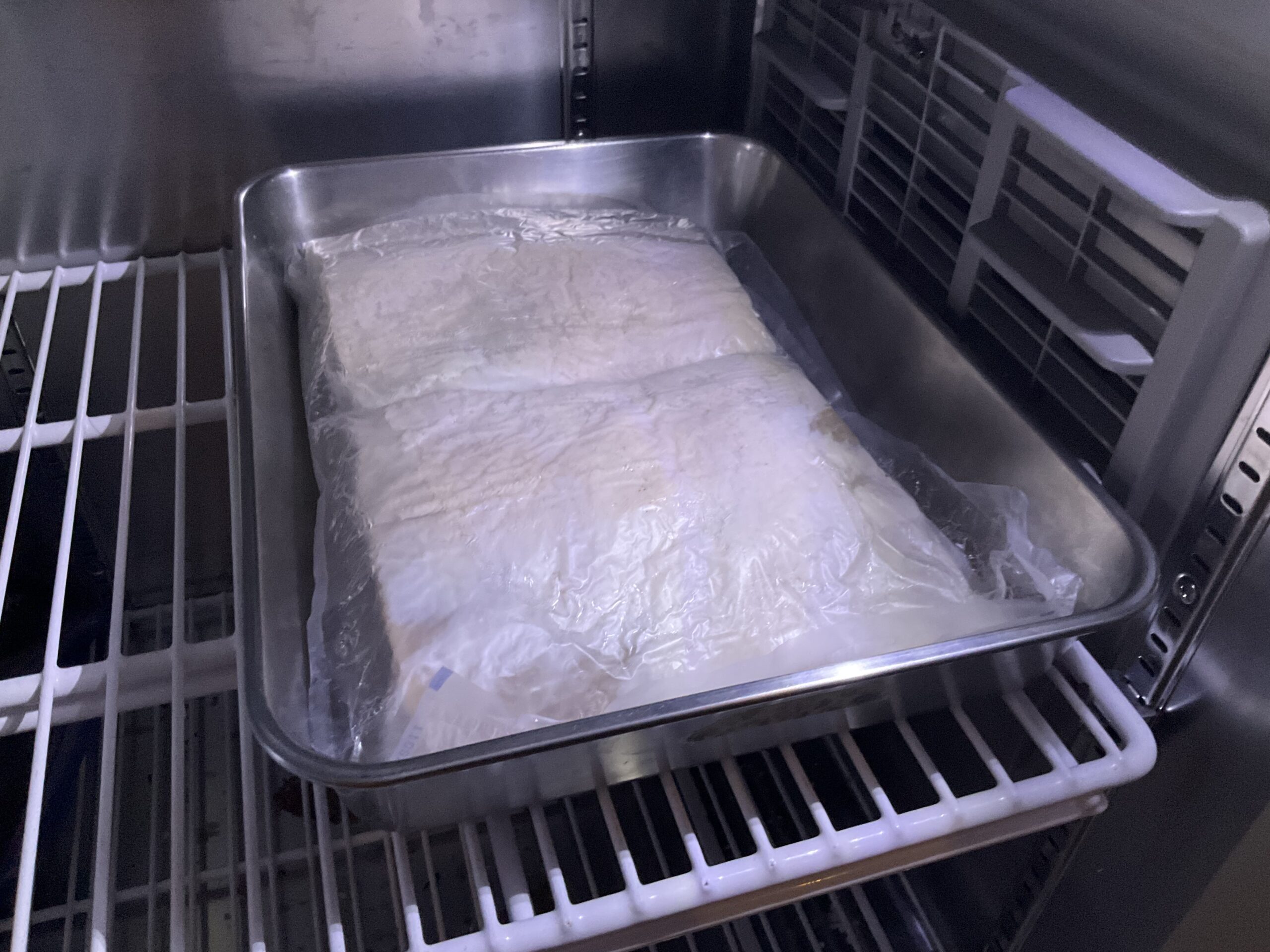 肉の塩気は半日かかって、どうやらいい感じに抜けた気がするので、水からあげて、もう一度脱水シートで水抜き。いったいいつハムになるんだっけ?(笑)