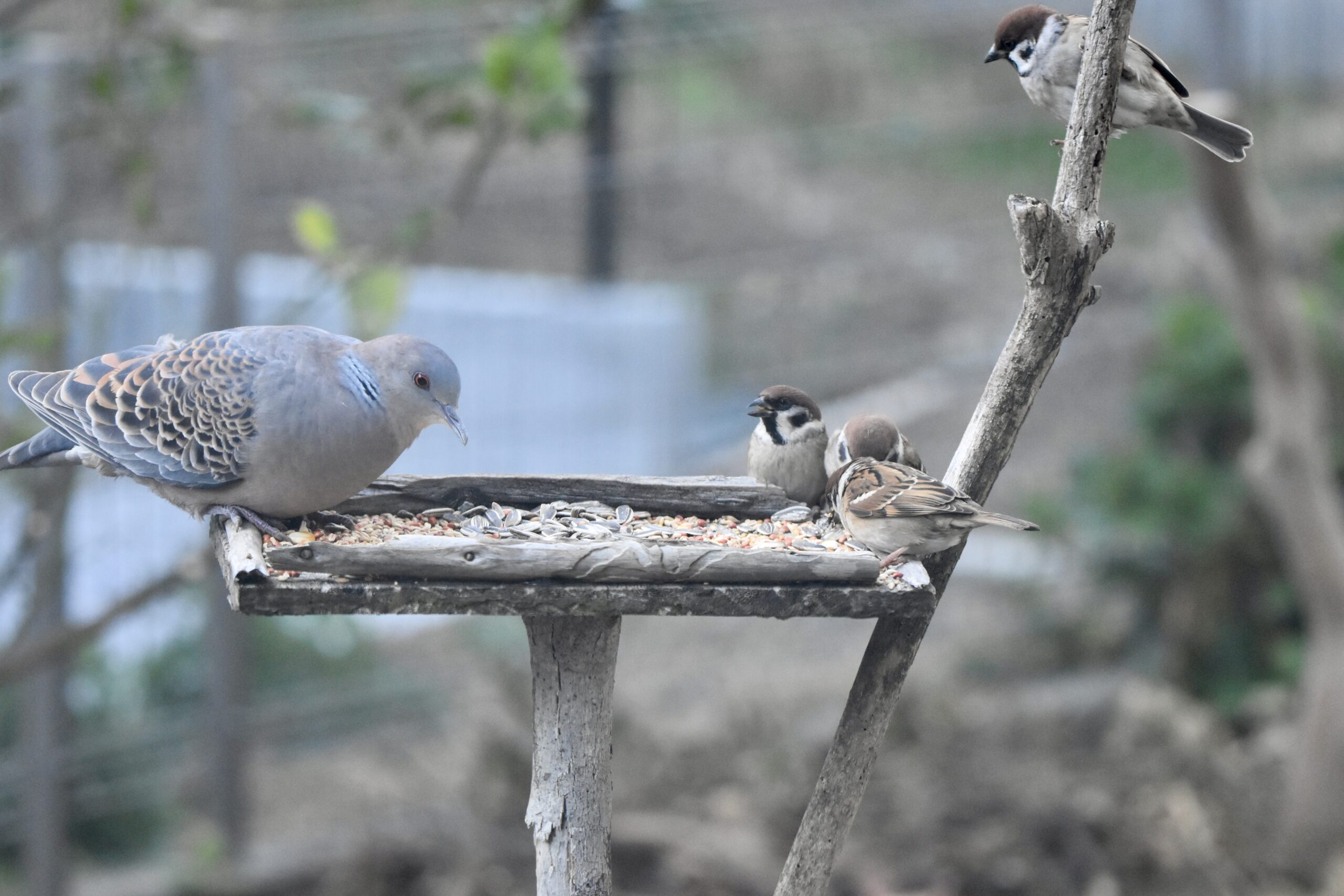 年末に設置した庭の餌台。朝、鳥たちの待ち構えっぷりがすごい。餌を乗せて背を向けると、もうキジバトが飛んできている。餌台では大きいキジバトがスズメに対して優勢。シジュウカラはヒマワリの種を素早く取って、安全な離れた場所で、足で押さえて嘴で殻を割って中身を食べる。