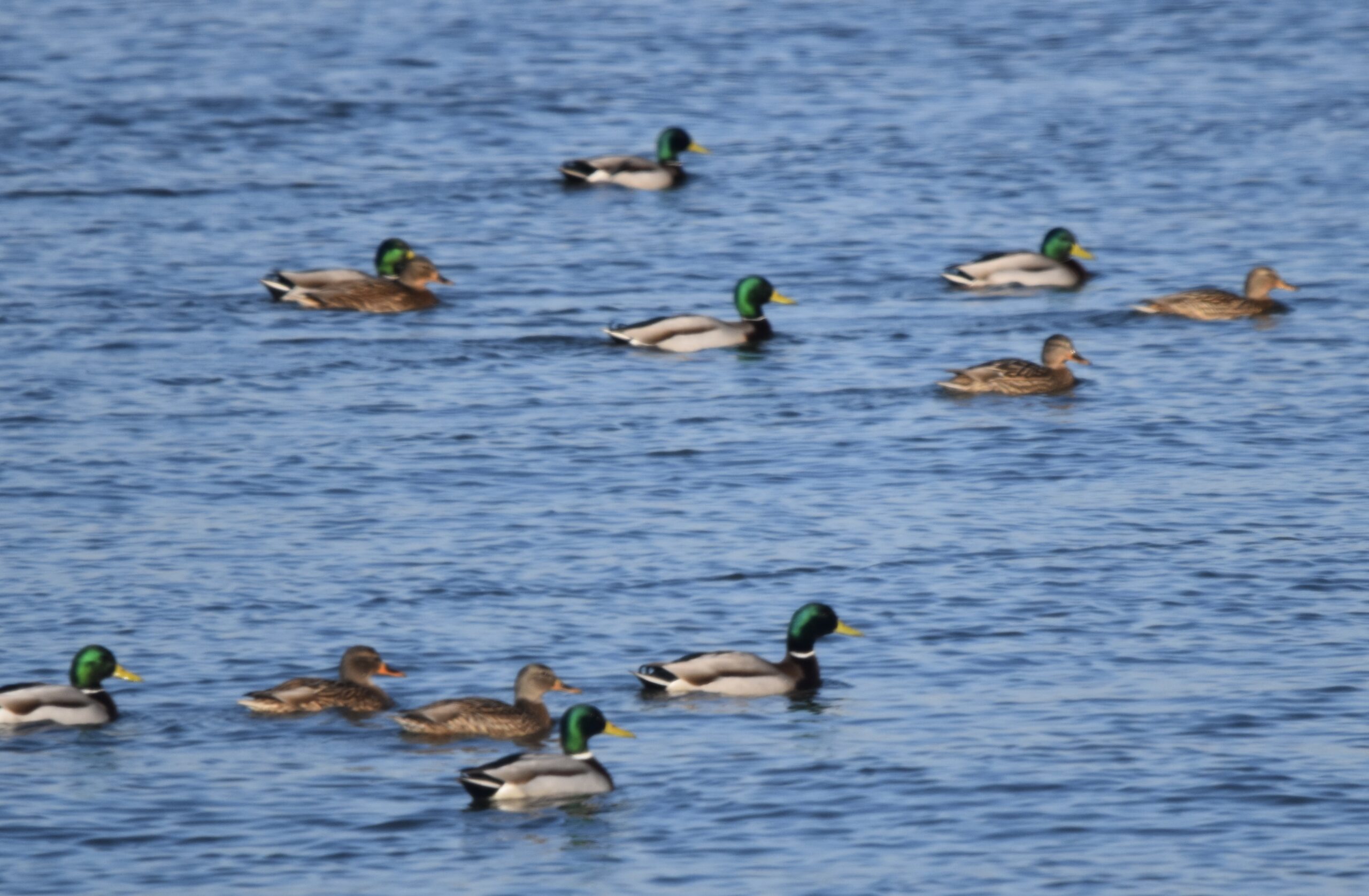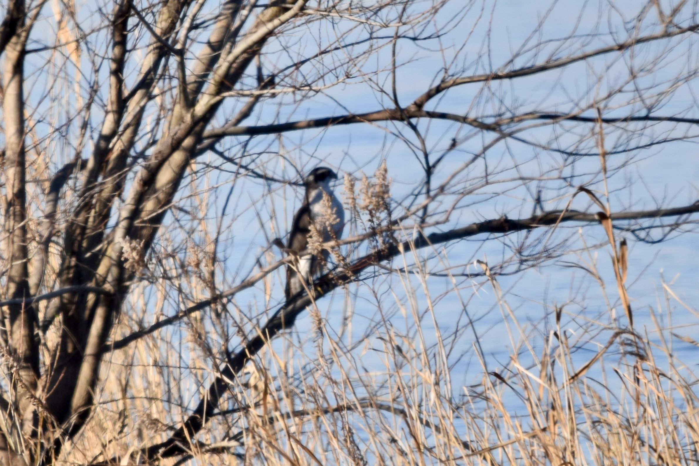 一方、霞ヶ浦の湖面には、カモがわんさか浮かんでいる。これはもう数が多過ぎて全部はちゃんと見ていられないほど。マガモやオナガガモが多い。これはマガモ。カモの仲間は越冬地でオスがメスにアピールしてカップルを作るので、オスは冬になると繁殖羽になって美しい。ちなみにこういうカモは実は多くが夜行性で、夜、農地に飛んできて落穂などを食べていて、昼間は基本、湖面で浮いて休んでいる。だから観察していても、ウミアイサみたいに面白くない。でも車を走らせていたら、一群が湖岸から、スーッと大急ぎで沖に離れて行くのを発見。思い当たることがあって近くに行ってみるとやはりいた。カモを狙うオオタカが湖岸の木に来て隙を窺っていた。