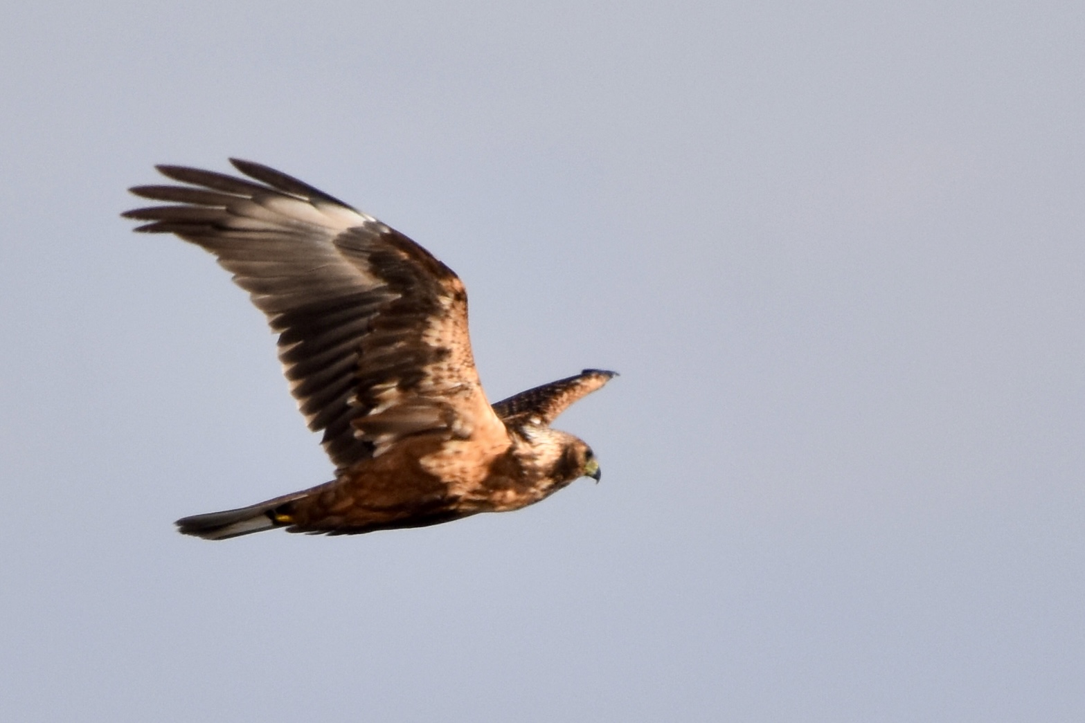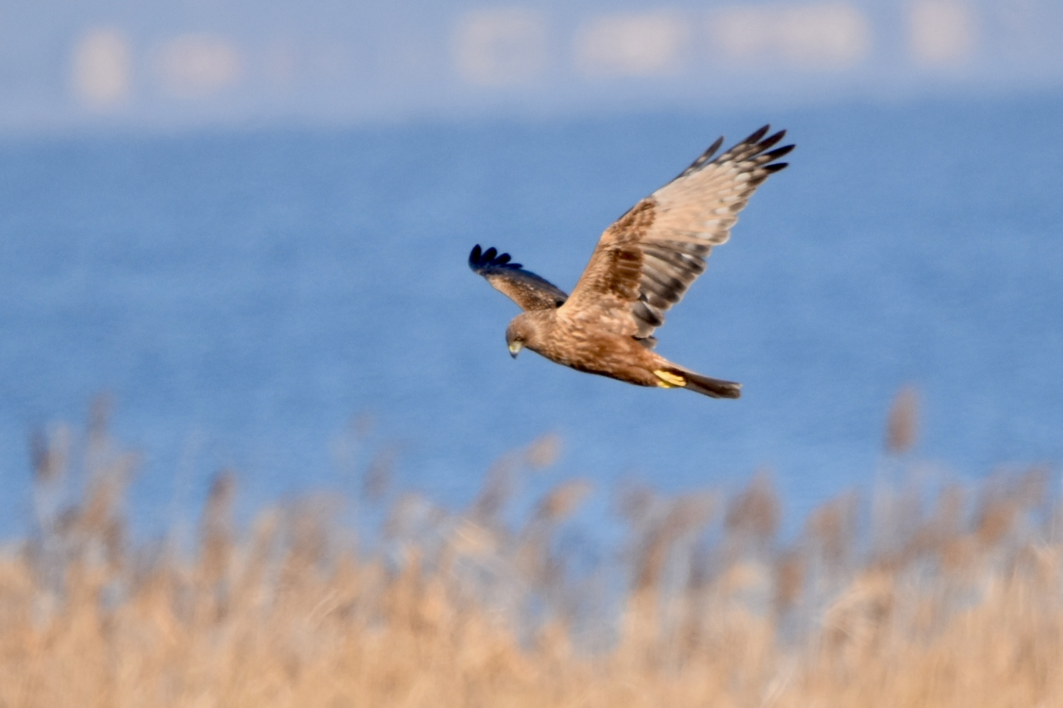 オオタカはカモに気付かれたからか、私が近づく前に飛んでしまった。またどこか別の隠れ場所からカモを狙うのだろう。バンバン出てくるわけではないのだけど、車を走らせていると、結構、猛禽類に出会える。オオタカの他、ハイタカ、ノスリ、ミサゴ、チュウヒ、ハヤブサ、チョウゲンボウ、コチョウゲンボウといった種類を今回は観察。オオタカが飛び去った後、アシ原の上を昨日ねぐら入りを観察したチュウヒが舞い始めた。翼をV字に保ってアシ原の上を低空で飛び回る独特のスタイル。