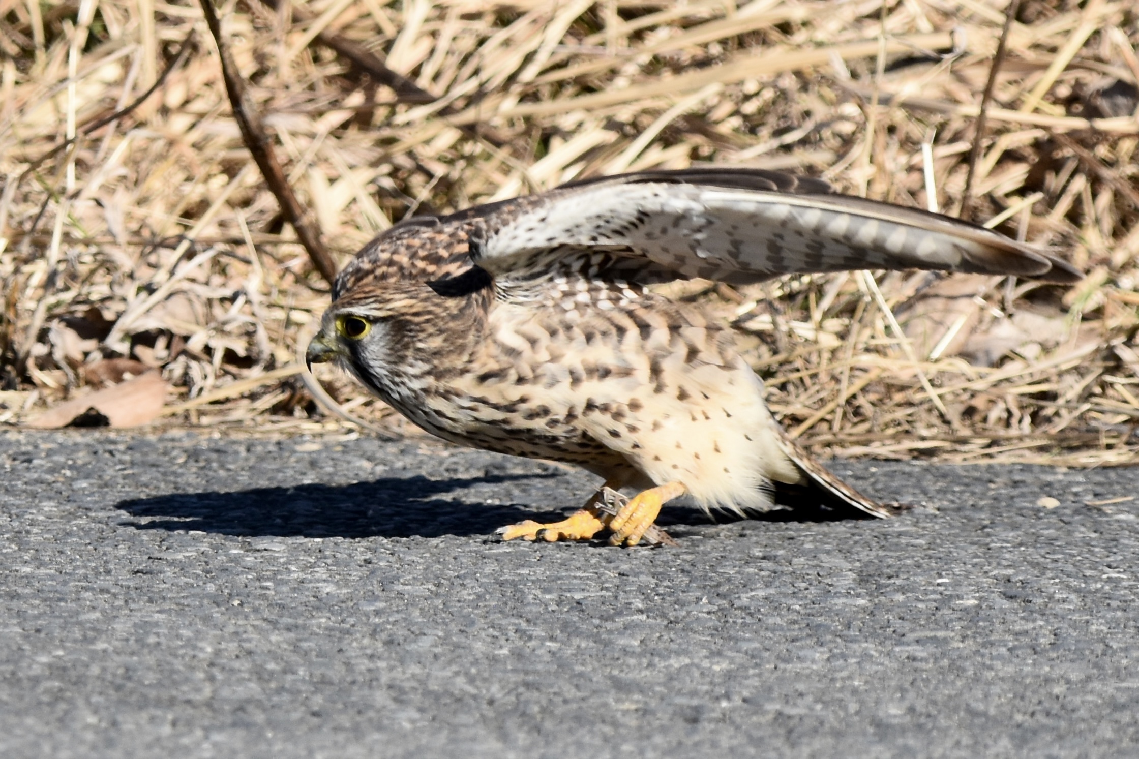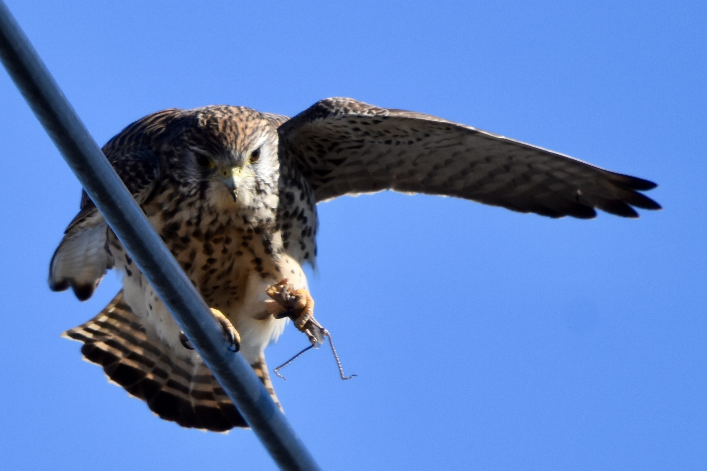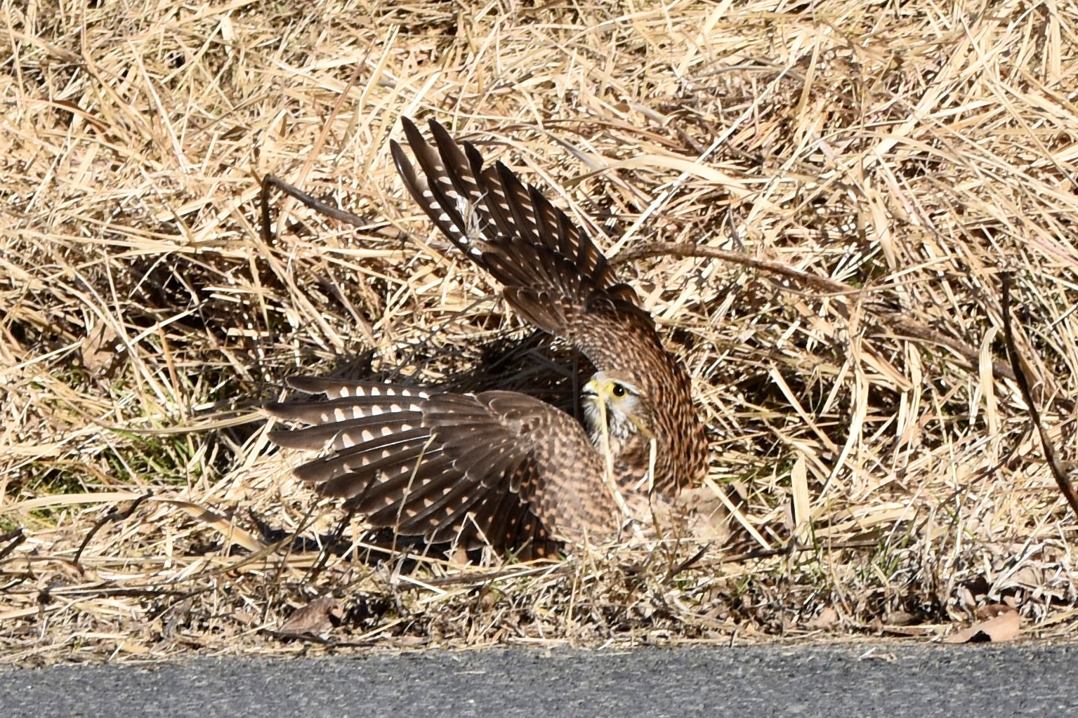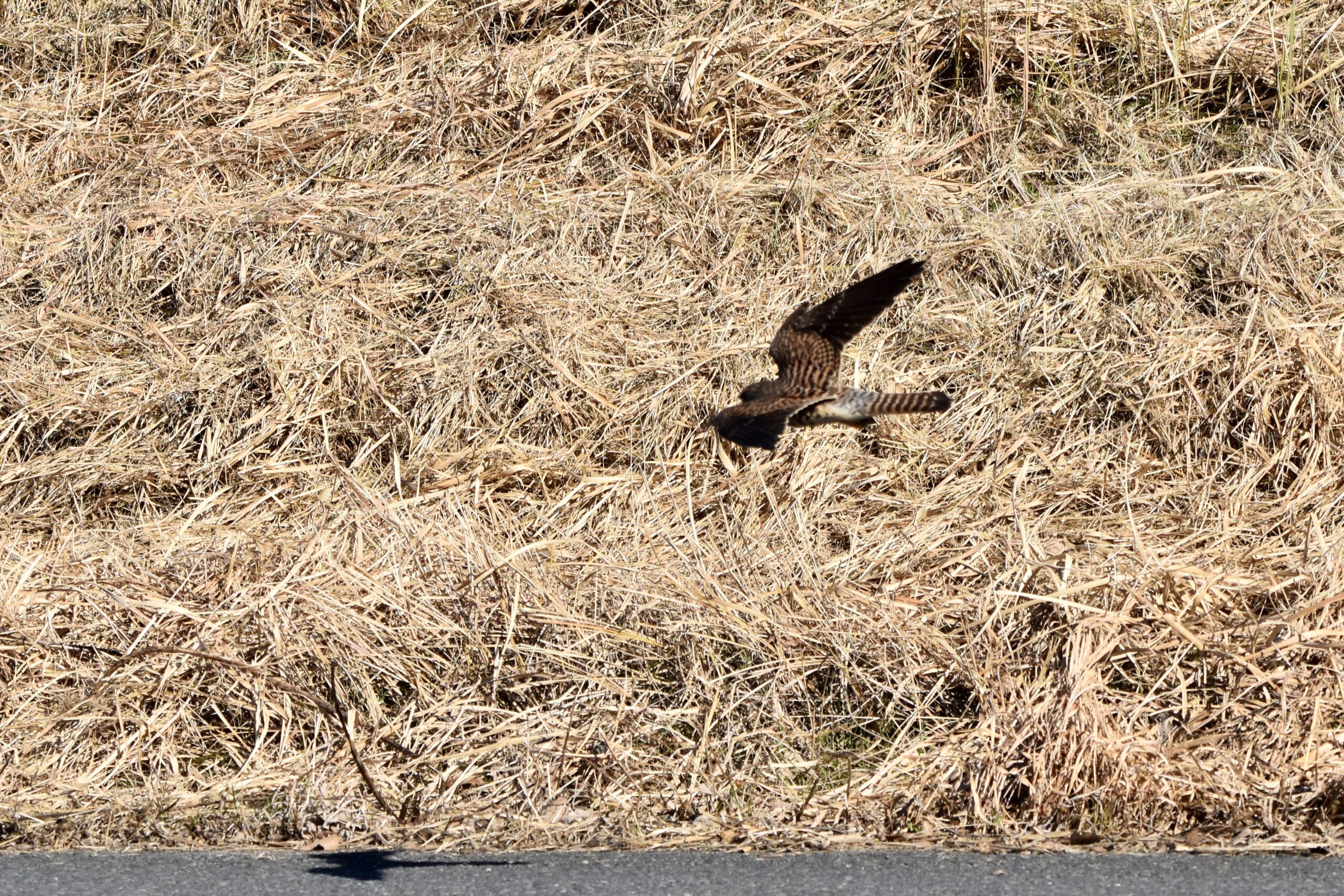 もうこのくらいでお腹いっぱいかもしれませんが、今回のハイライトはこのあとのチョウゲンボウ。ハヤブサの仲間のハトくらいの大きさの猛禽。猛禽類は一般的に警戒心が強くて、あまり近くで観察できないのだけど、この子は警戒心がごく薄。そしてこの電柱から目の前の道ぎわの草むらに繰り返しハンティング。もうシャッター切り放題。鳥を色々見ていると、稀にこういうボーナスタイムみたいなことがある。人がいるのを気にせずに電柱から草むらに突っ込んで来るので、私も順光で風上側に陣取って待ち構える。