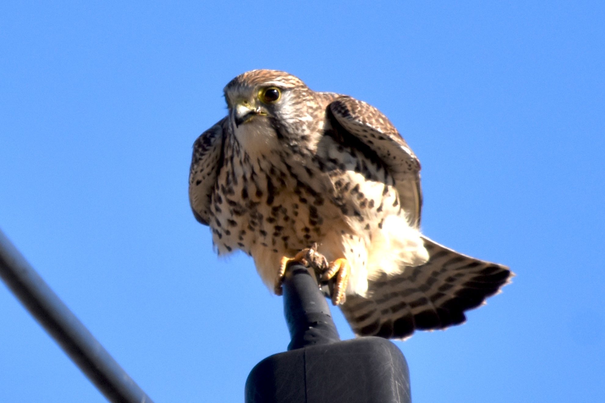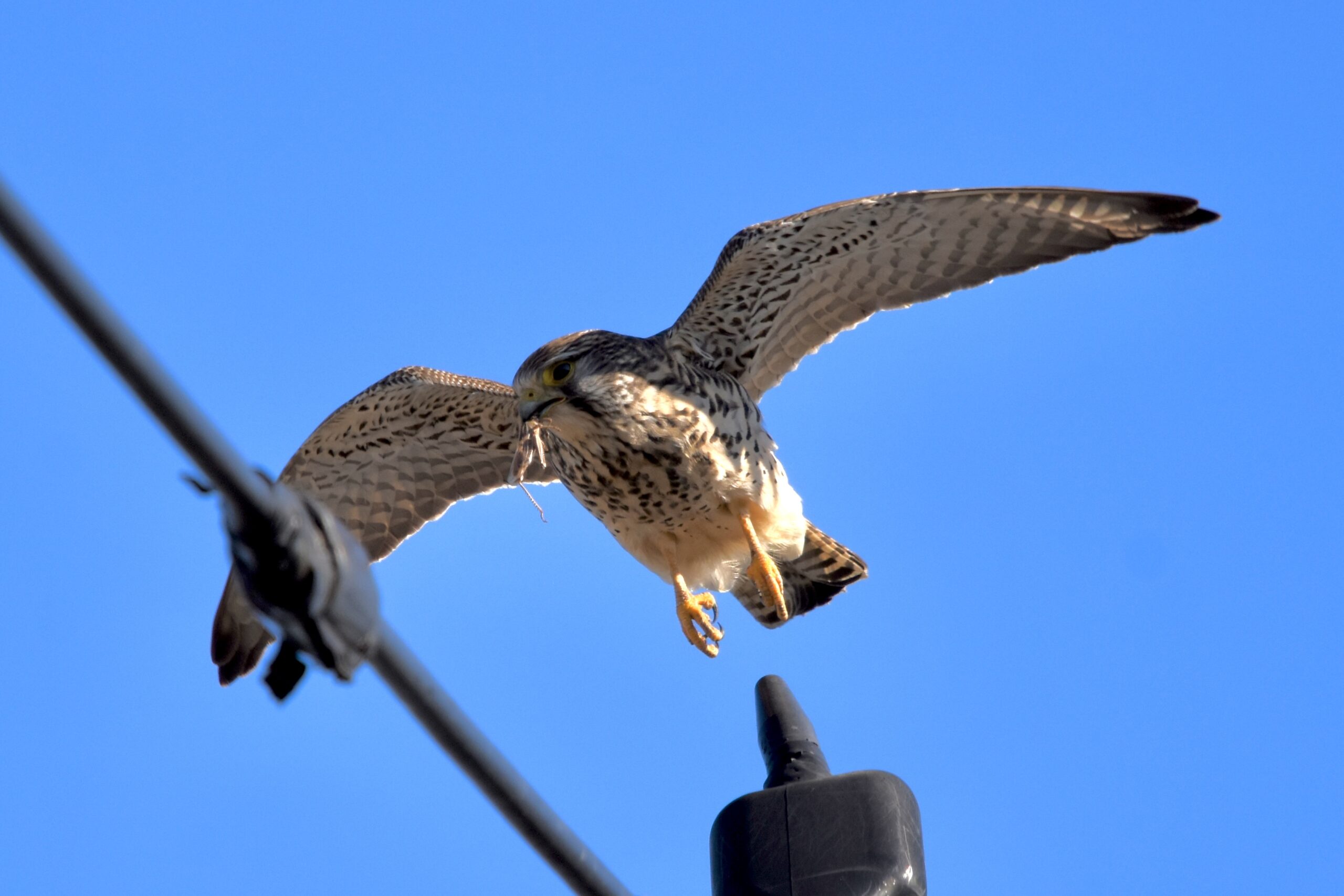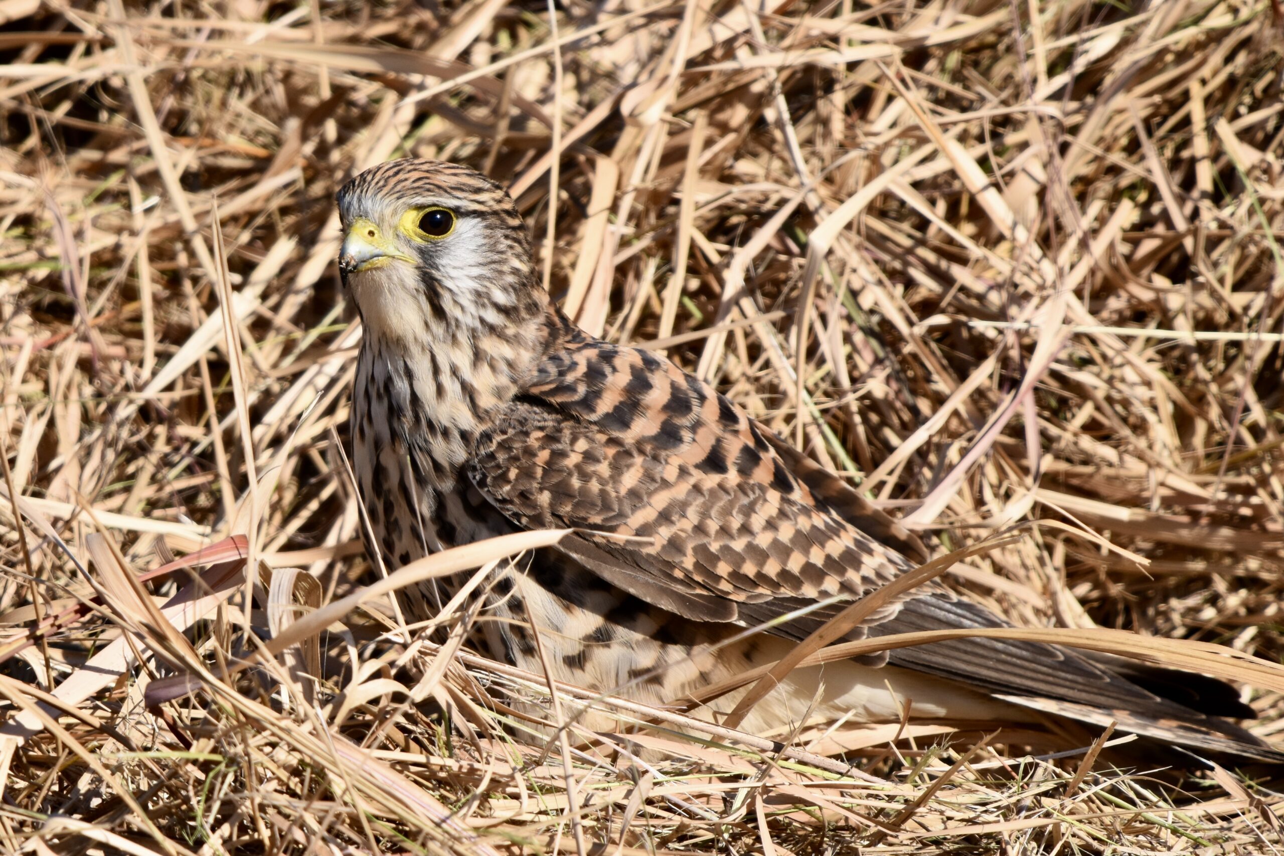 もうこのくらいでお腹いっぱいかもしれませんが、今回のハイライトはこのあとのチョウゲンボウ。ハヤブサの仲間のハトくらいの大きさの猛禽。猛禽類は一般的に警戒心が強くて、あまり近くで観察できないのだけど、この子は警戒心がごく薄。そしてこの電柱から目の前の道ぎわの草むらに繰り返しハンティング。もうシャッター切り放題。鳥を色々見ていると、稀にこういうボーナスタイムみたいなことがある。人がいるのを気にせずに電柱から草むらに突っ込んで来るので、私も順光で風上側に陣取って待ち構える。
