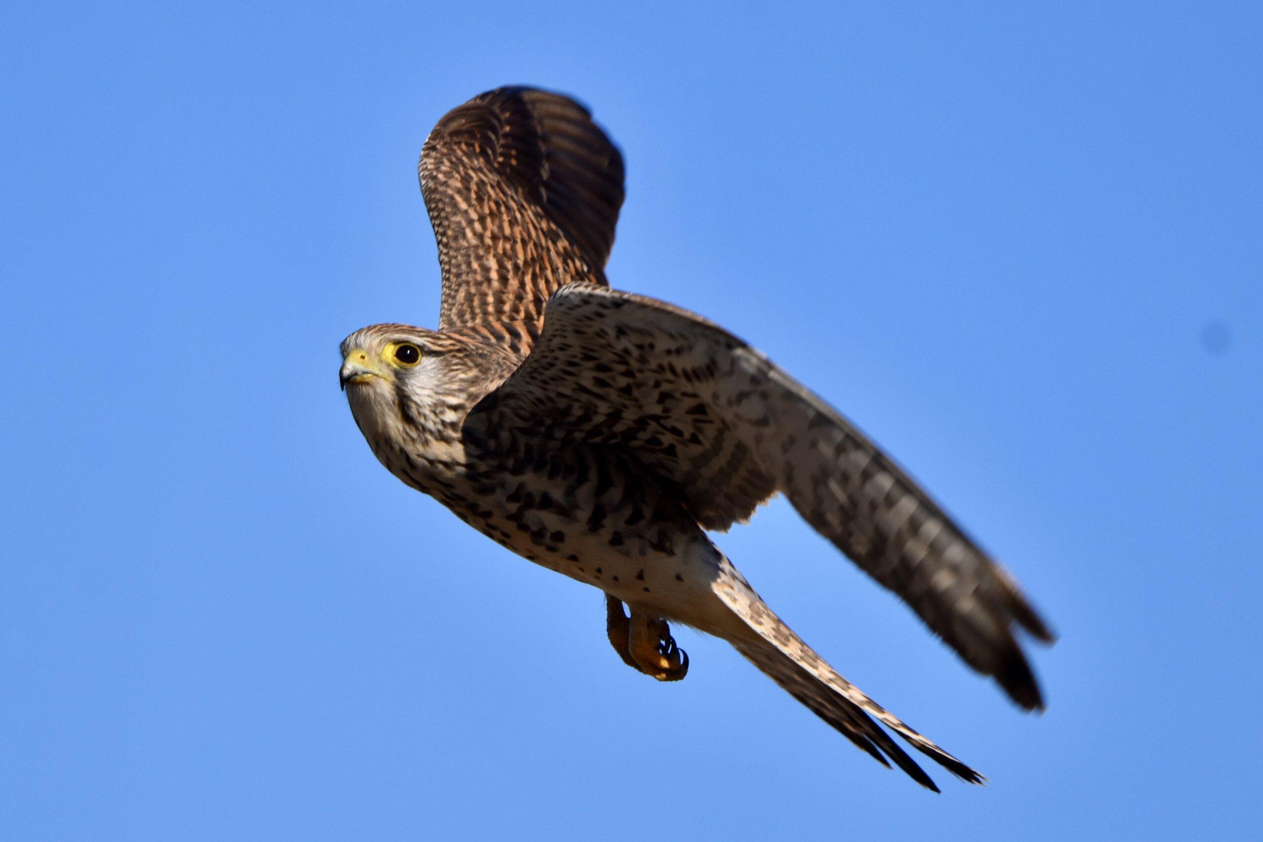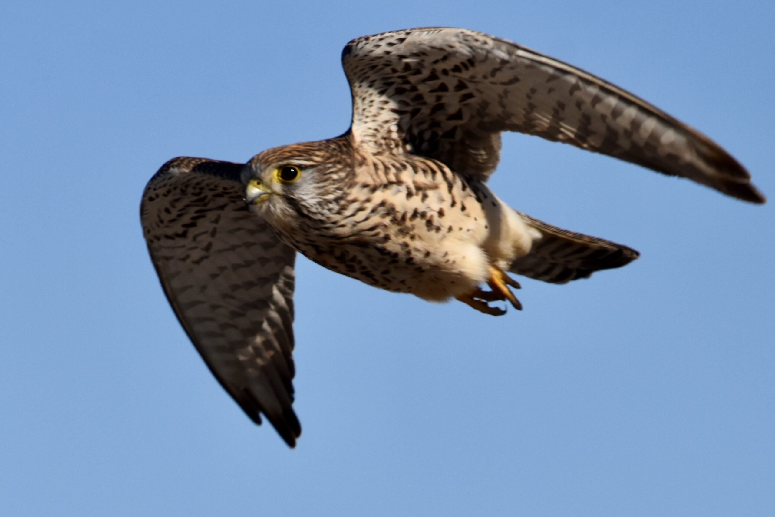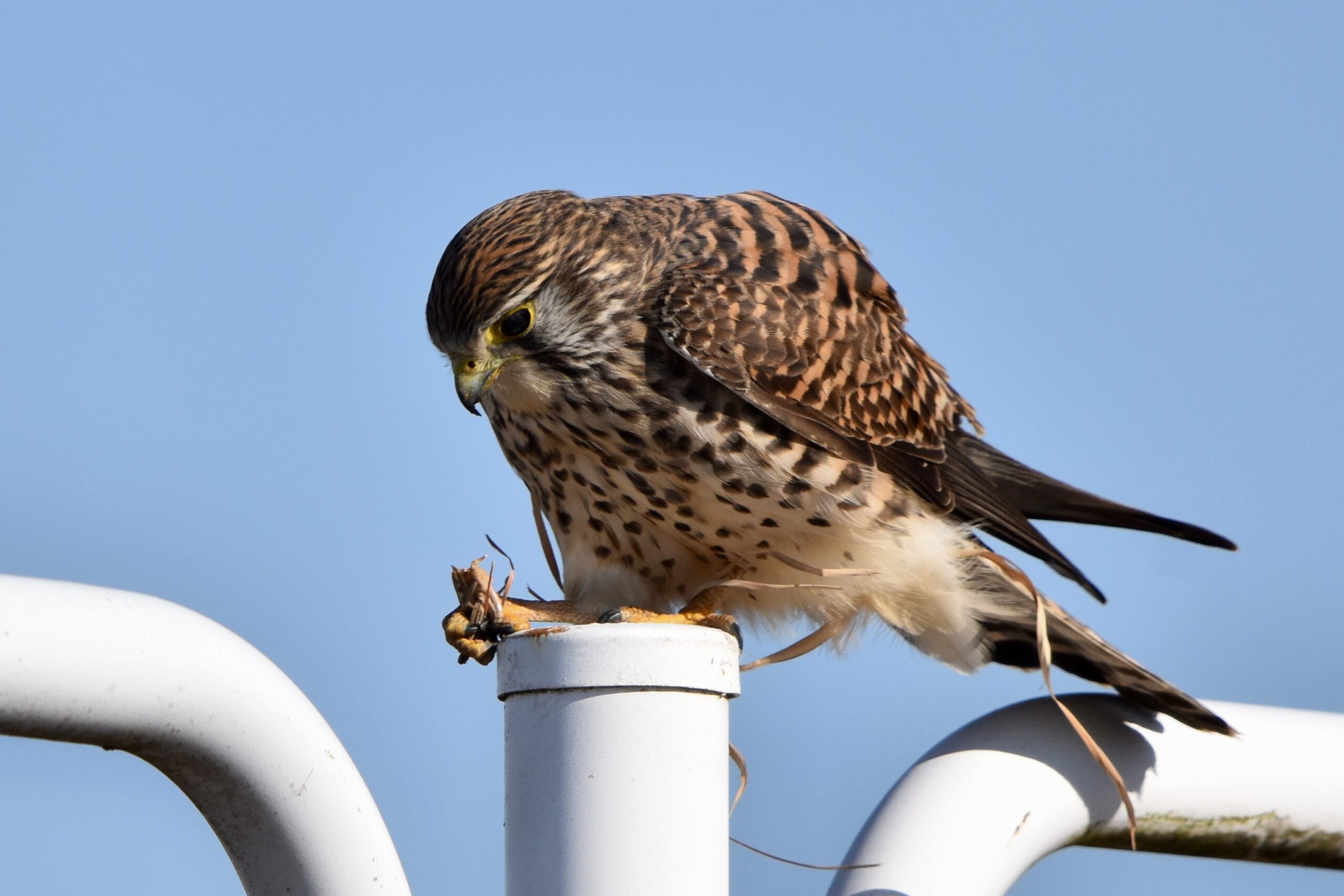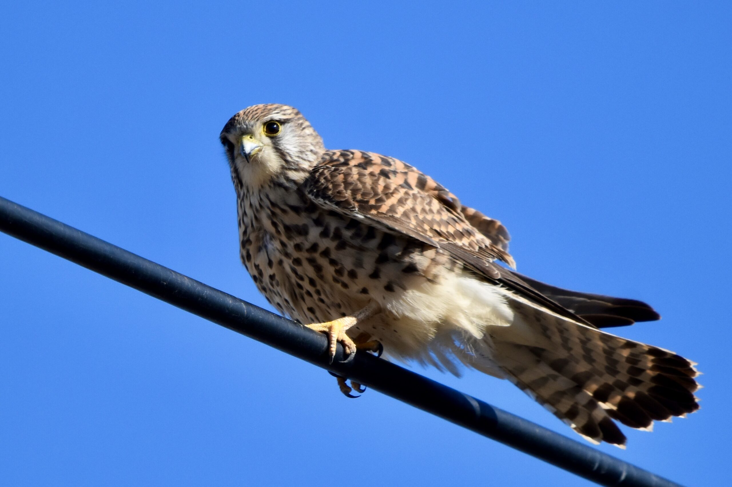 もうこのくらいでお腹いっぱいかもしれませんが、今回のハイライトはこのあとのチョウゲンボウ。ハヤブサの仲間のハトくらいの大きさの猛禽。猛禽類は一般的に警戒心が強くて、あまり近くで観察できないのだけど、この子は警戒心がごく薄。そしてこの電柱から目の前の道ぎわの草むらに繰り返しハンティング。もうシャッター切り放題。鳥を色々見ていると、稀にこういうボーナスタイムみたいなことがある。人がいるのを気にせずに電柱から草むらに突っ込んで来るので、私も順光で風上側に陣取って待ち構える。