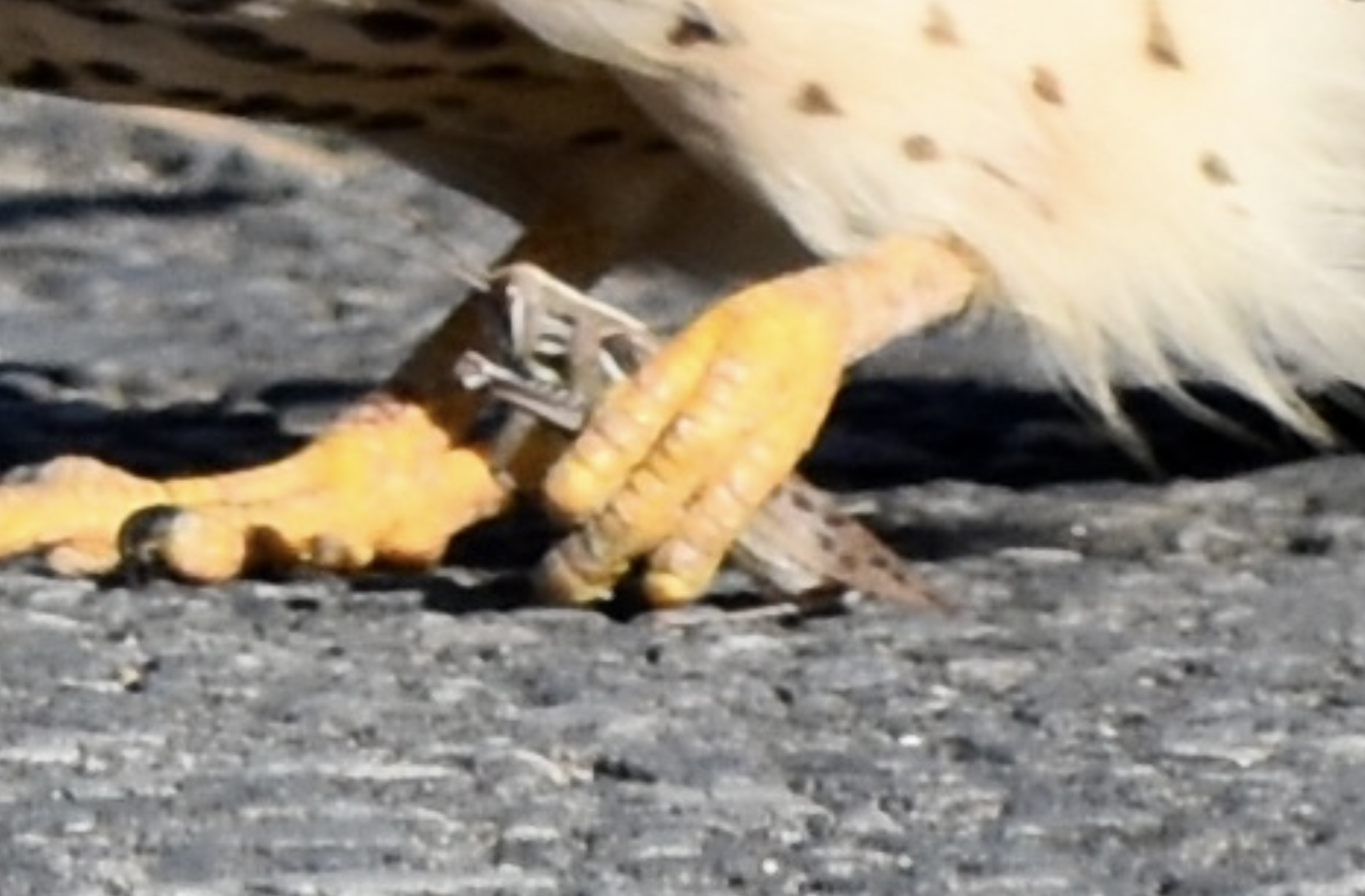 チョウゲンボウはネズミとか小鳥とかも捕まえる猛禽なのだけど、昆虫も結構食べる。でも遠くから観察していると、鳥の場合、何を食べているのか、わからないことが多い。でもこれだけ近いとさすがに昆虫であることがわかる。バッタの足が見える。しかしこのクソ寒い真冬の草むらにバッタなんているのか?と思うが、写真を拡大して正体が判明。