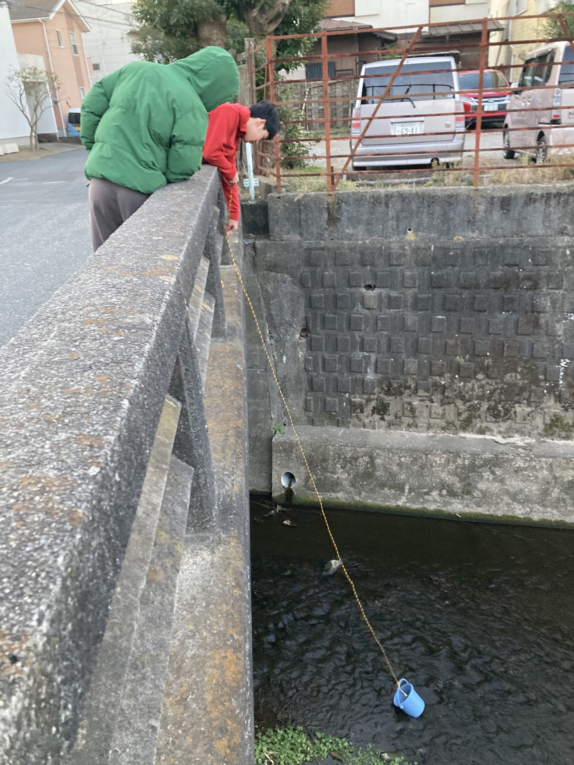 朝6時。まだ真っ暗なので6時半に起こした。前の晩、どこから川に降りようか?と言っていたが、長いロープがあったので、バケツとセットで用意しておいてやった。早朝に橋から川の水を汲んでいるのは結構不審者だけど、無事サンプル採取成功。