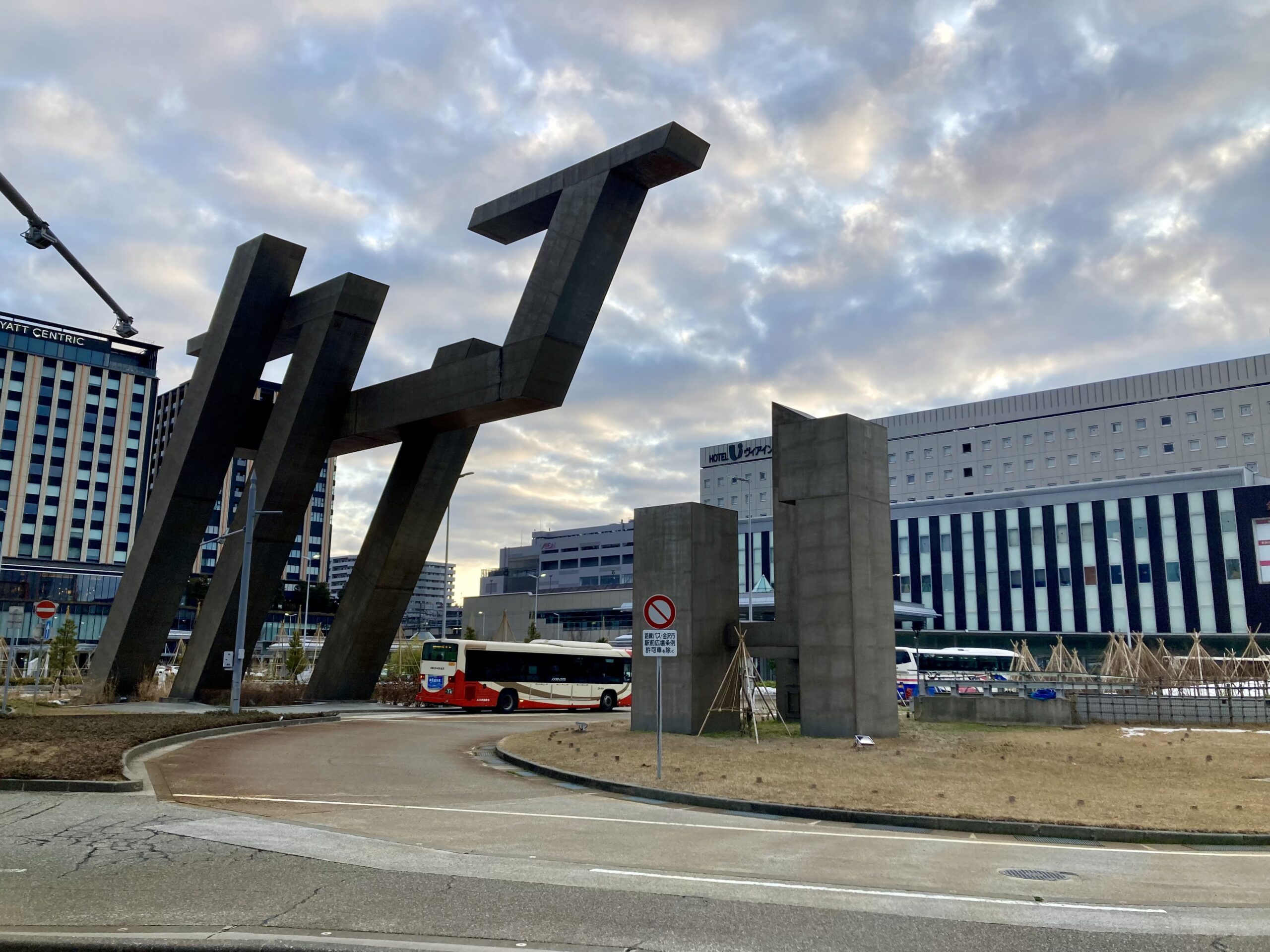 息子にエールを送ったあと、トーさんは今朝もランニング。今日は城と反対側、県庁に向かってみる。駅前の巨大なモニュメントが謎。カナザワと読めるという噂。