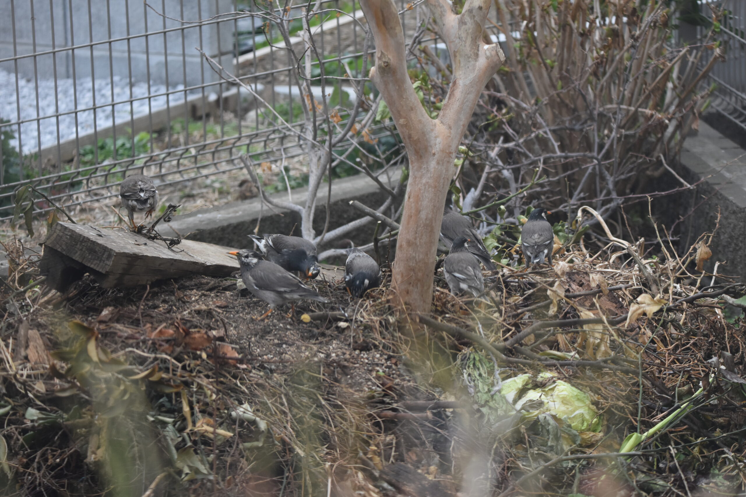 これは数日前のムクドリ。庭には雨でもたくさん鳥が来ている。餌台の餌にはキジバトとスズメ。シジュウカラはもっぱらヒマワリの種だけ。離れたところまで運んで、足で押さえて嘴で割って中身を食べる。キジバトはヒマワリの種も丸飲み。みかんにはヒヨドリとメジロ。ムクドリは餌台にもみかんにも来ず、サルスベリの根本の小山を盛んにつついている。この山は庭木の切った枝とか、古くなった鉢植えの土とかを重ねてあるのだけど、多い時はムクドリが10羽くらいこの山を歩いてずっとつついている。何を食べているのか?何が彼らをこれほど惹きつけるのか?分からん。