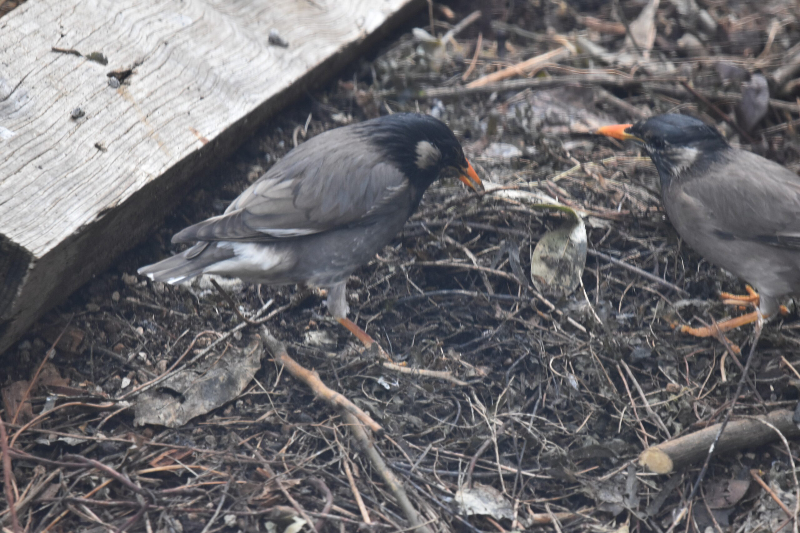 彼らが特にご執心なのが、サルスベリの木の根元に積み上げて枝や枯れ草、土の小山。夏場ならこういうところに虫がたくさんいたりするかもしれない。でも寒い時期、少なくとも人間の目で見て、生き物の姿は確認できない。