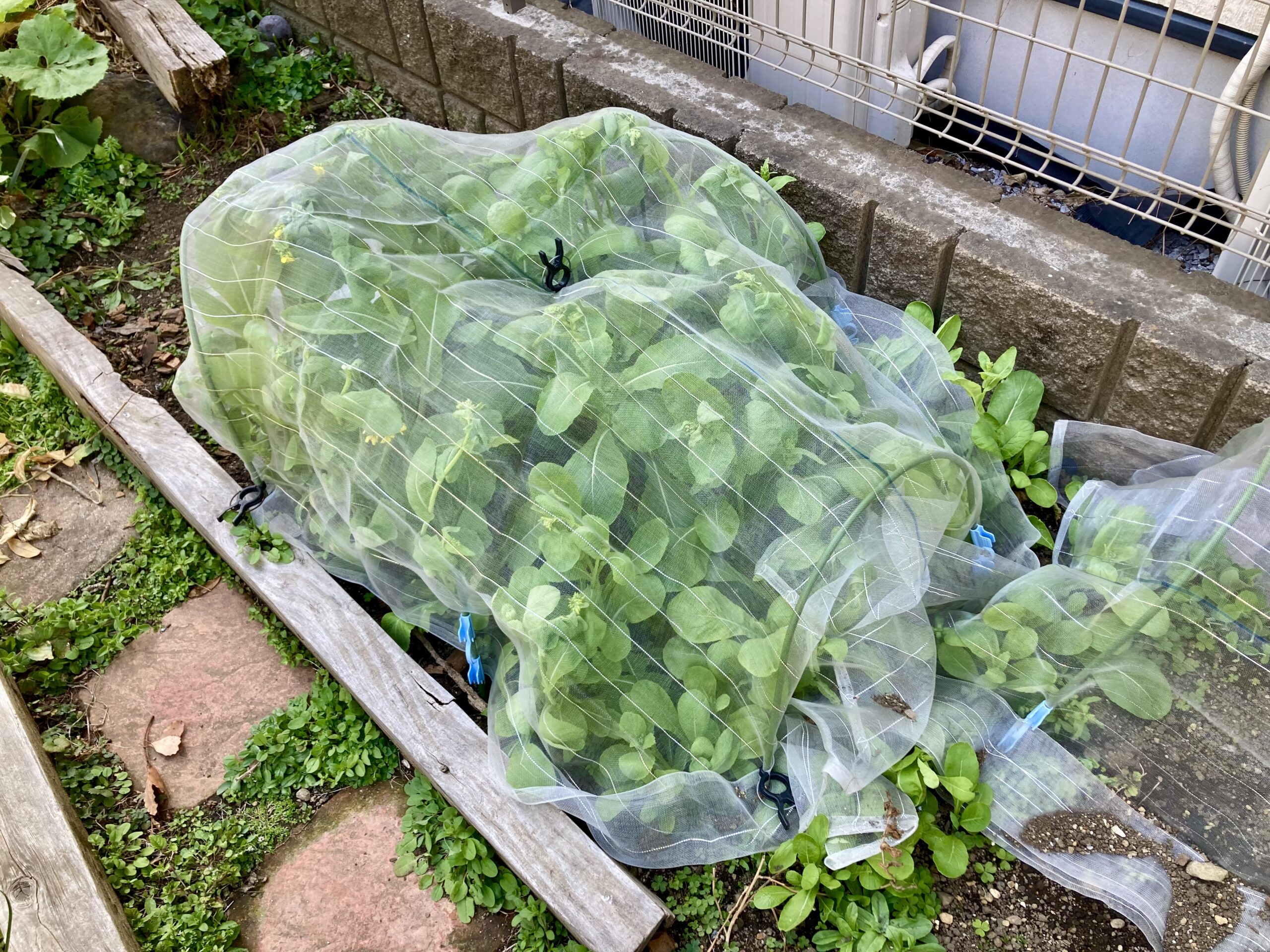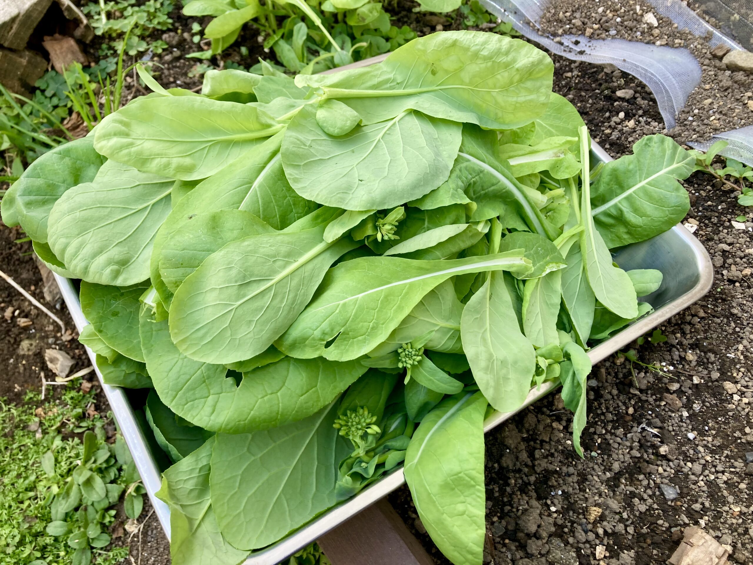 今日の課題は庭の小松菜の片付け。鳥がかじるのでネットを張ったけど、不精しているうちに、大松菜、というか、花も咲き出し、菜の花になりつつある。去年も同じように花が咲いて、無理やり、鍋に投入して食べたような。とりあえず、今年は葉だけ、収穫。結構な量になった。
