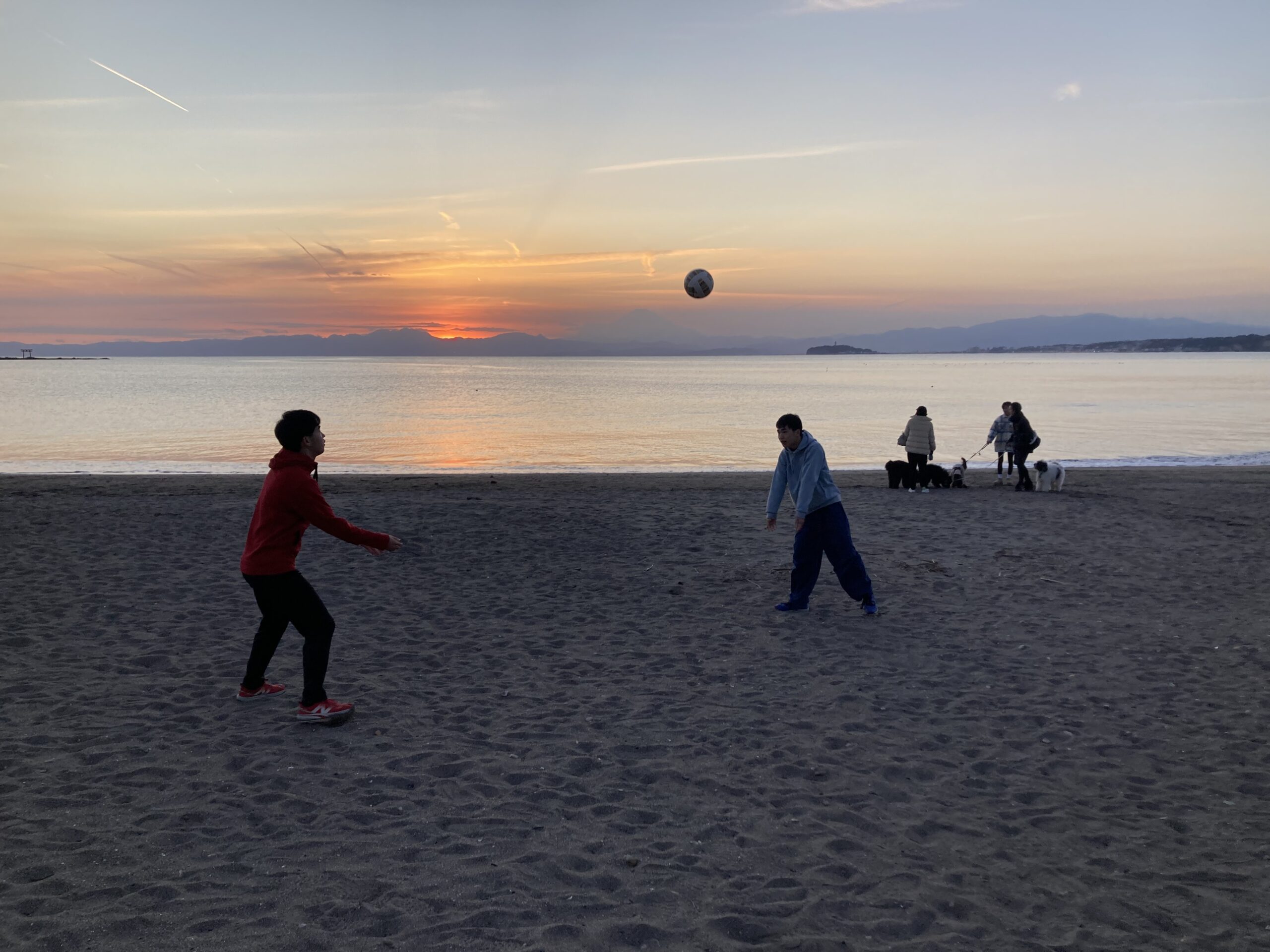 風が収まったので、夕方は海で双子と運動。二人ともバレーボールがうまくなった。