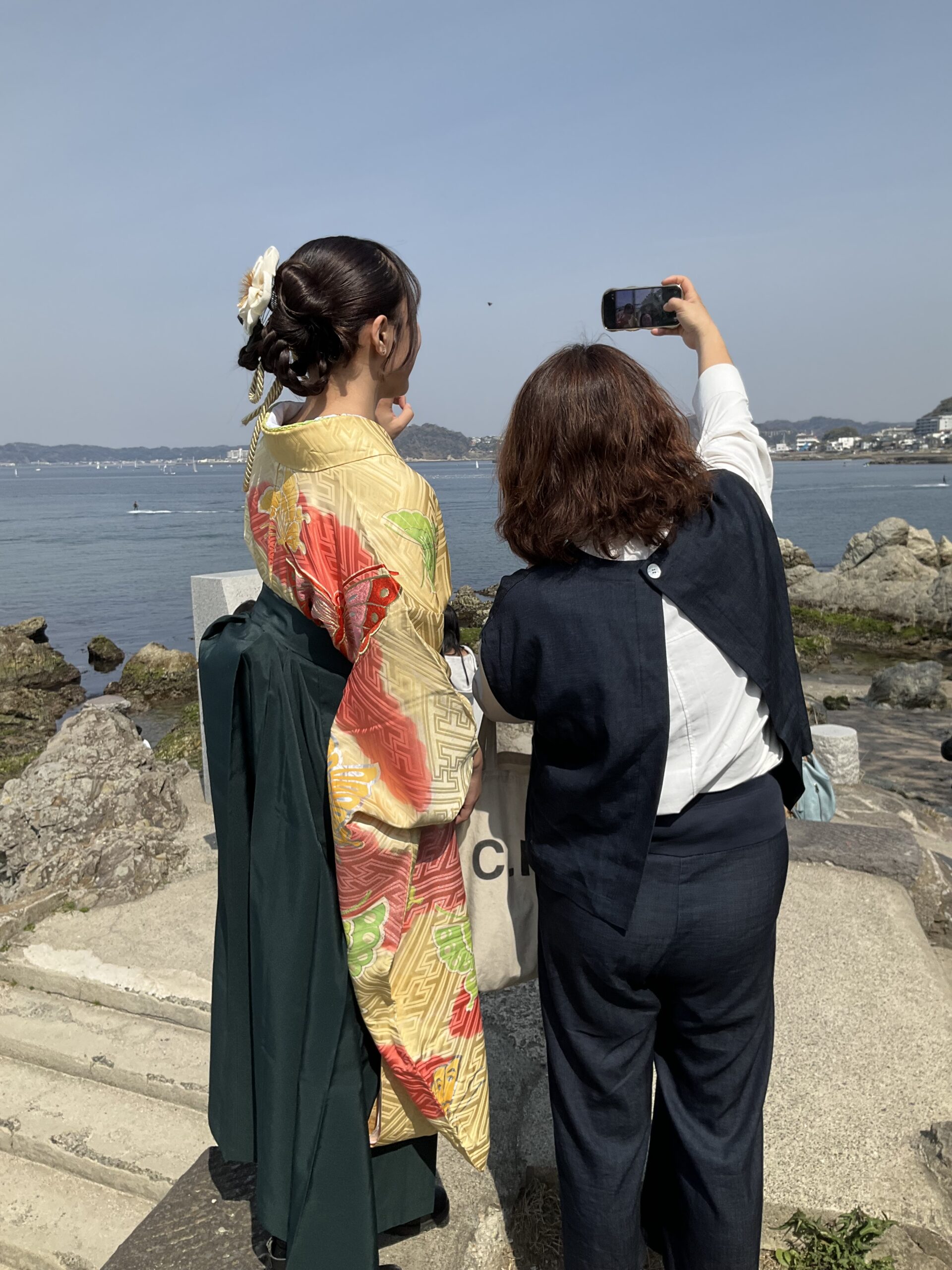 長女の大学の卒業式。会場は大学ではなく幕張メッセだし、式は行かなくていいかな、と思っていたけど、妻の書道の展示も月島で今日までなので、それを見るべく、着付けした長女と妻と車で習志野へ。その前に森戸神社でお参りして海岸で記念撮影。大きくなった。というか、もう大人だ。