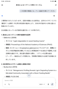 出たばかりのChatGPTは、質問すると、事実と異なる嘘八百をしゃあしゃあと回答するので、ちと信用できないと思っていたのだけど、現在のGemini、精密だ。で、まあこういう回答、我々としては、その根拠がちゃんとした論文や研究なの?というのが気になるので、それを示すように尋ねると回答は以下。