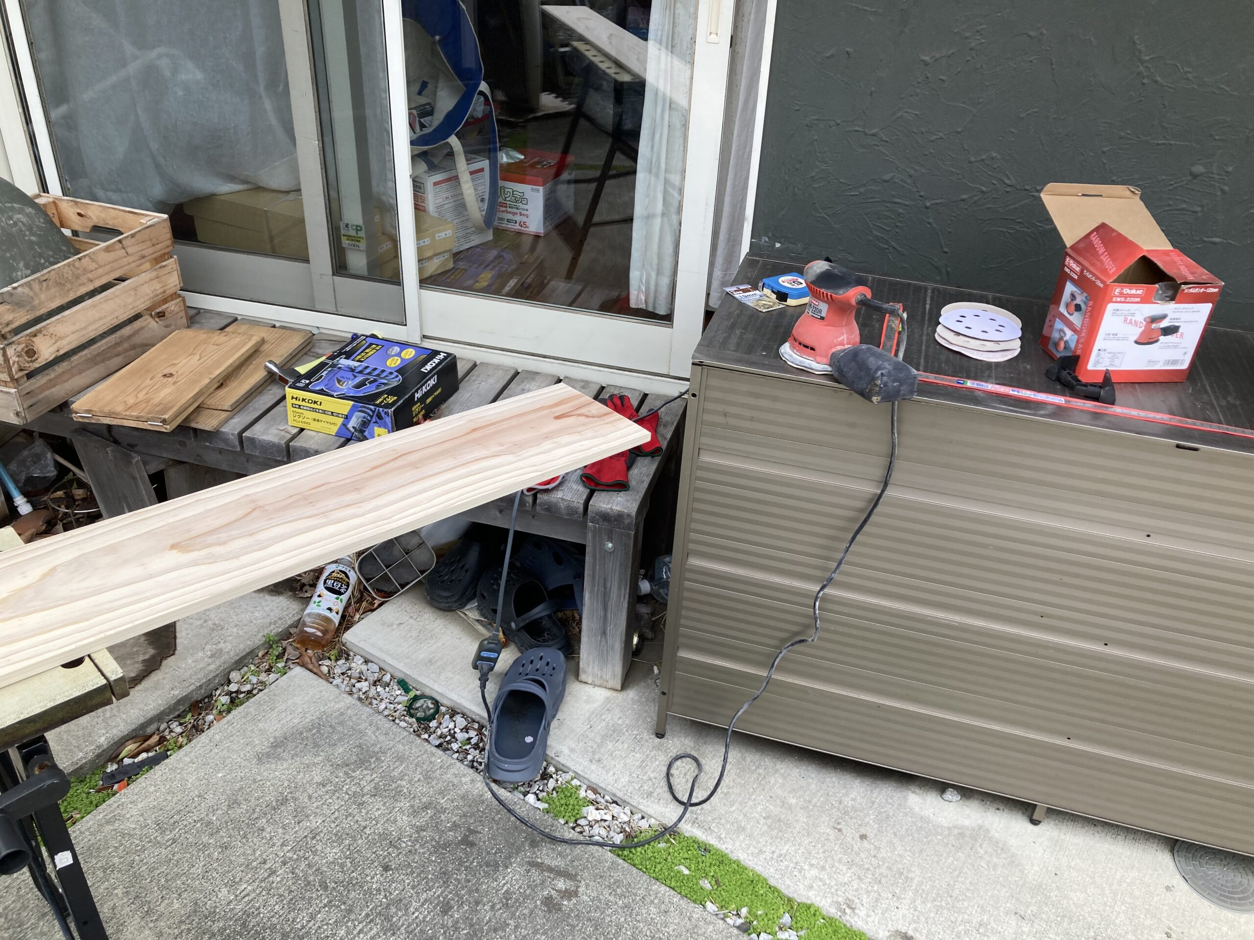駐車場に作業台とサンダー、ジグソーなどを出して工作開始。電動工具で作業するのって、楽だし楽しいのだけど、機械の音がとてもうるさいのと、木屑や削りカスが盛大に飛ぶので、マンションやアパートに住んでいると、ちょっとできない。田舎の一軒家のメリットの一つ。まあそれでもうるさいので時間とやり過ぎには気は遣う。